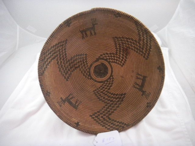 White Mountain Apache Basket, Measuring 12 by 3 inches. This has crosses and deer. Condition some slight staining. Shipping $20.00