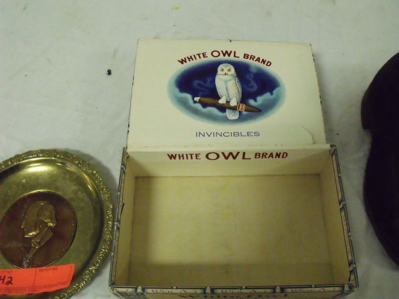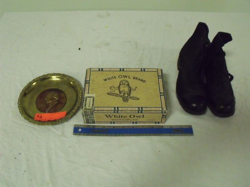 Cigar Box, Childs felt shoes and brass dish