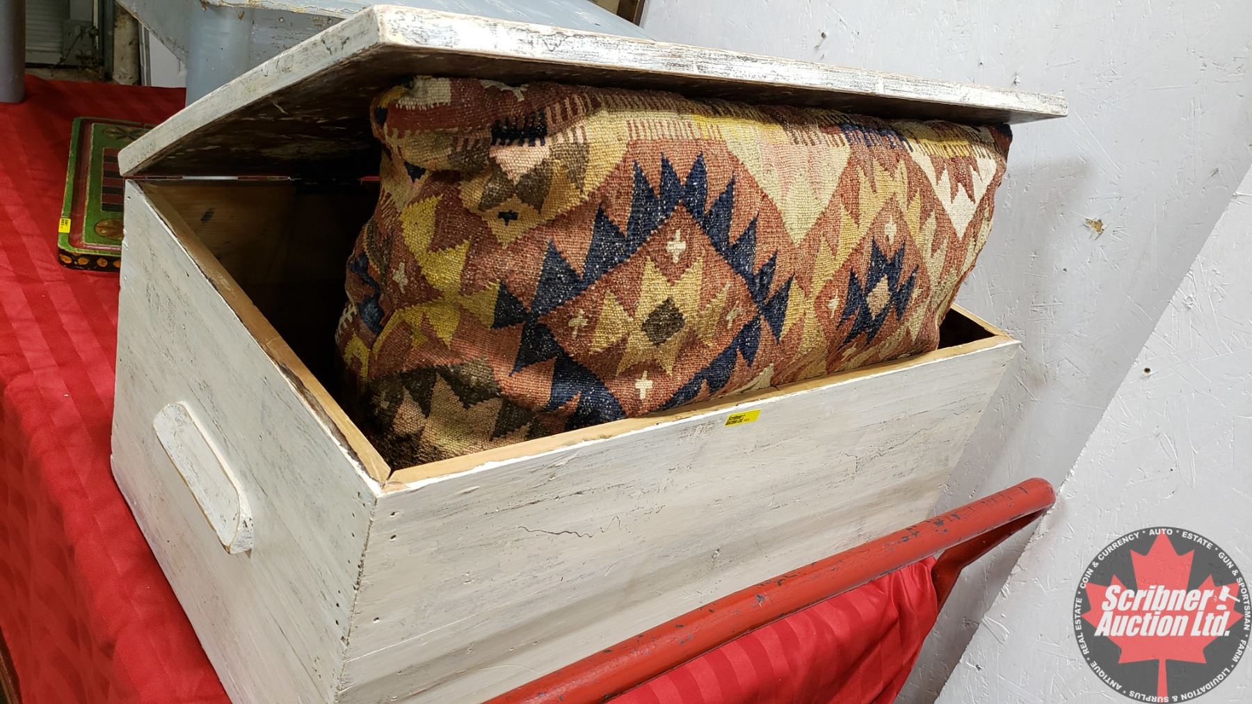 White Painted Wood Trunk with Kilim Pillow (Did you know: "Kilim Pillows are made from upcycled hand-woven vintage Anatolian kilims, hand-knotted rug fragments or new ikat fabrics" . . . from www.kilim.com)