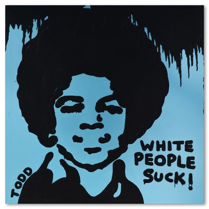"White People Suck" is an original acrylic painting on gallery wrapped canvas by Todd Goldman, hand signed by the artist. Includes Letter of Authenticity. Measures approx. 48" x 48" (image). Due to the way this piece was stored there may be minor wear or signs of age (such as wear on the corners) but the piece is in overall good condition.