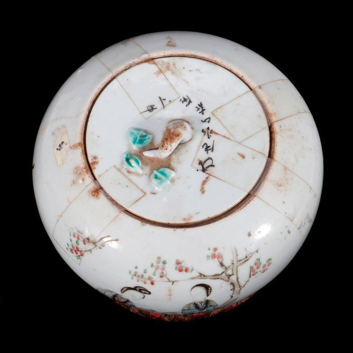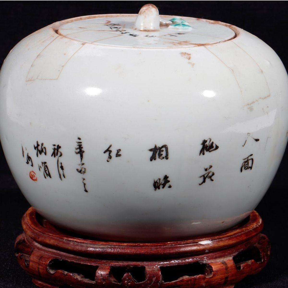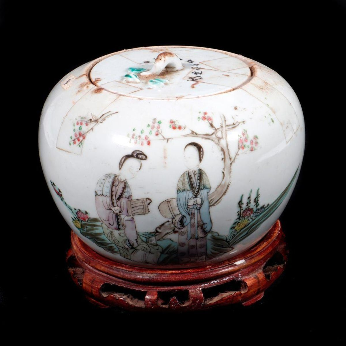 White Pictorial Ginger Jar on a Stand. Depicting a scene of two ladies by a tree. Writing on the lid with three green leaves. Writing along the jar, some characters have been eroded. Mark on the bottom. Measures 4 1/2in x 6in without the stand. Condition Report: All lots are sold as is and where is. Turner Auctions + Appraisals, LLC provides condition reports upon request to aid in your bidding decision. No statement regarding age, condition, kind, value, or quality of a lot, whether made orally at the auction or at any other time, or in writing in this catalog or elsewhere, shall be construed to be an express or implied warranty, representation, or assumption of liability. All sales are final, Turner Auctions + Appraisals, LLC does not give refunds based on condition. Turner Auctions + Appraisals, LLC does not perform any shipping or packing services. We do have a list of suggested shippers who gladly provide quotes prior to your bidding. Please visit our webpage for a list of recommended shippers.