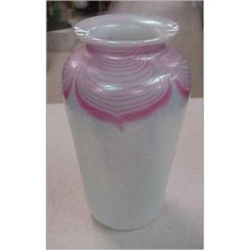 White/Pink Curtain opalescent O'Brien Curtain Design Art Glass Vase. Smudge on vase. Signed "OBGJ" on bottom. Buyer pays shipping/handling costs.
