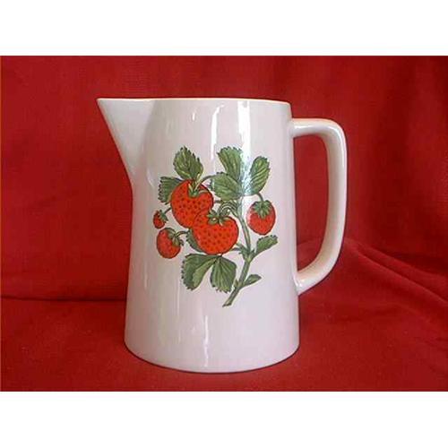 <table width="100%" border="0" cellspacing="0" cellpadding="4"><tr><td><em> </em></td></tr><tr> <td width="100%"> Pitcher is white with pretty red strawberry design. The pitcher is marked "Holiday Designs USA" and measures 8 inches