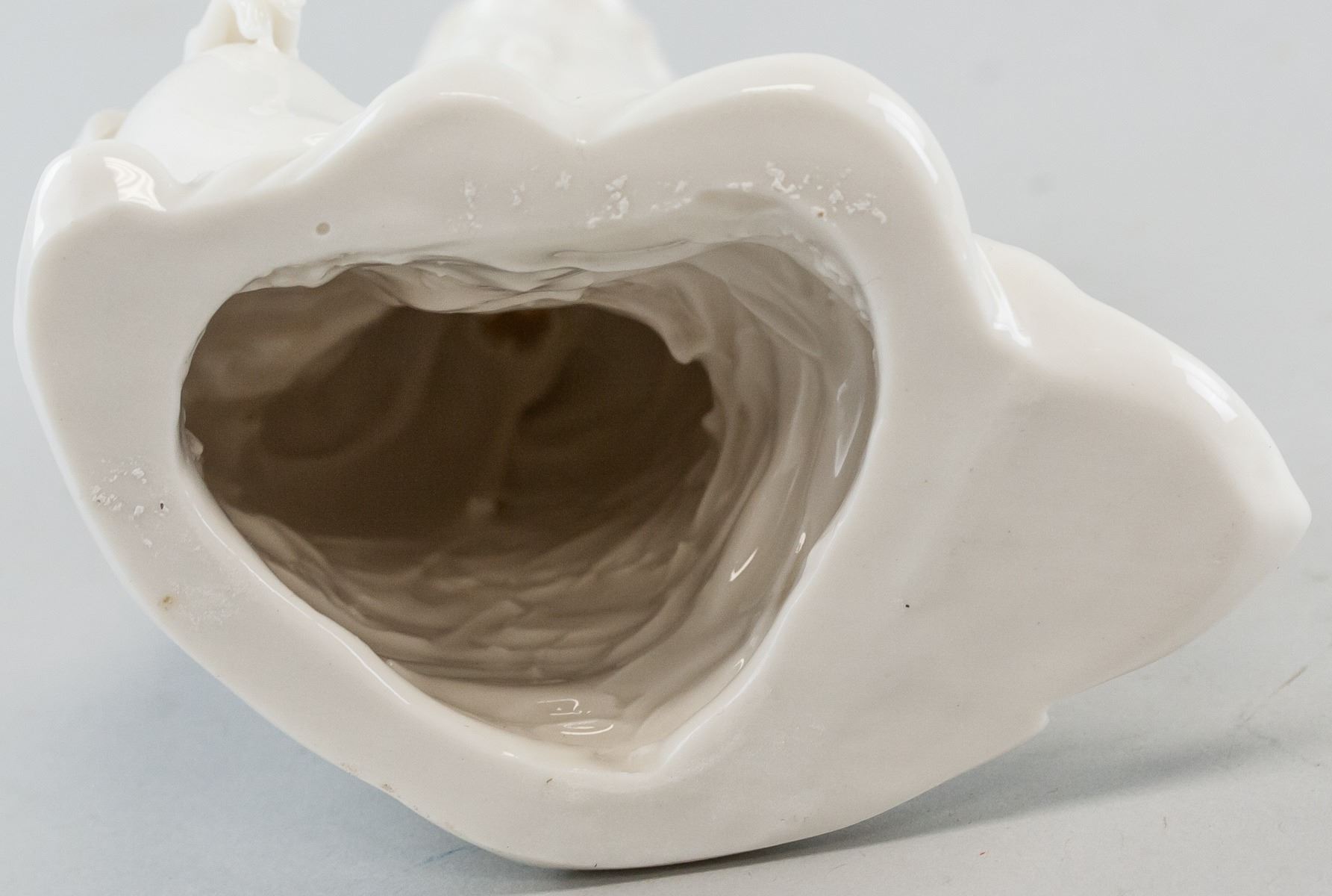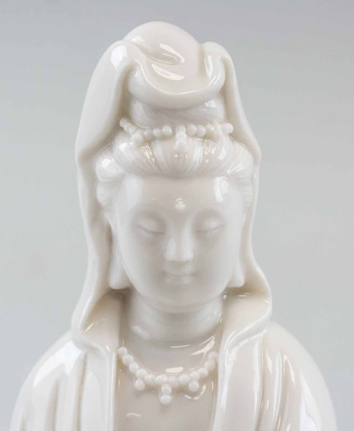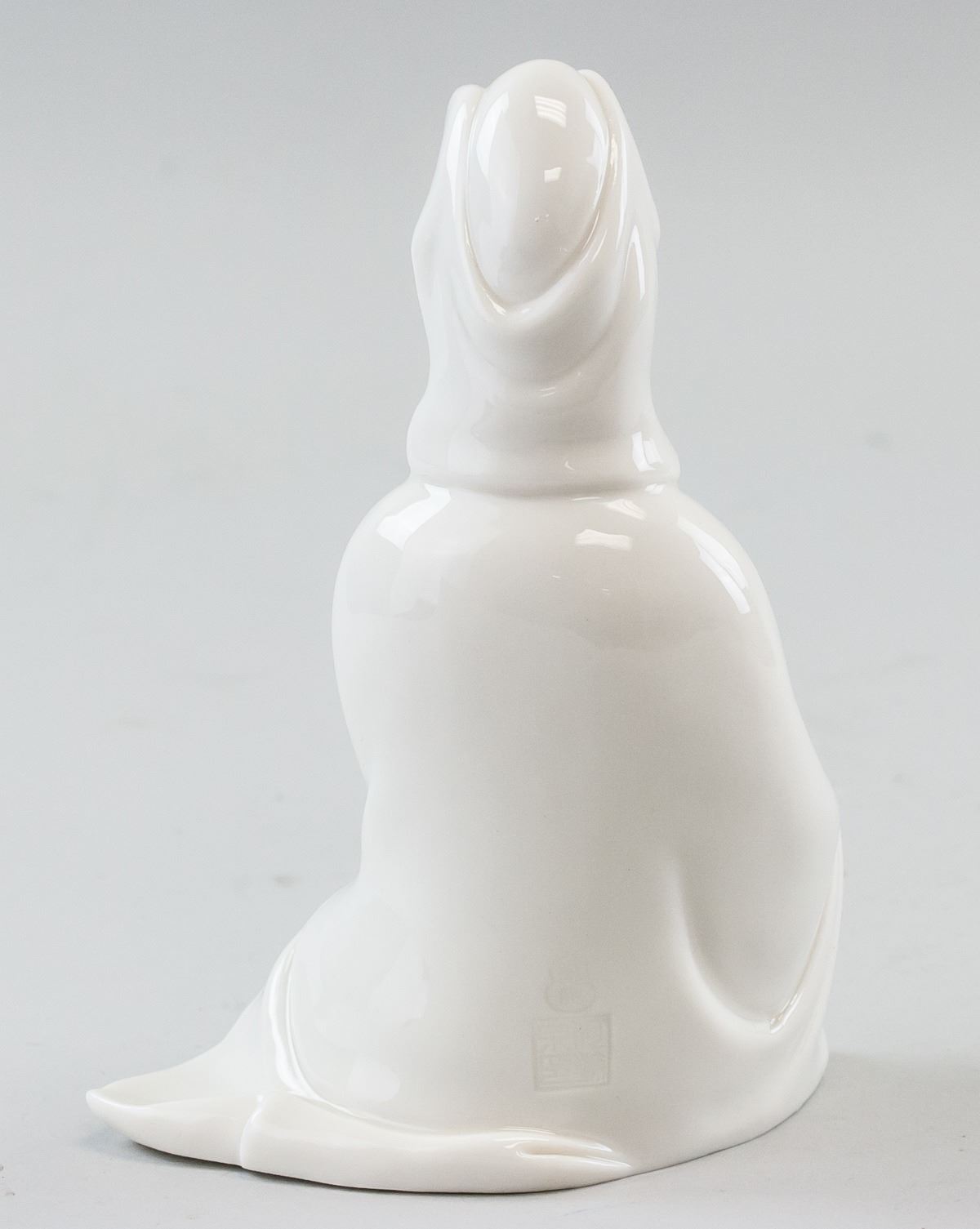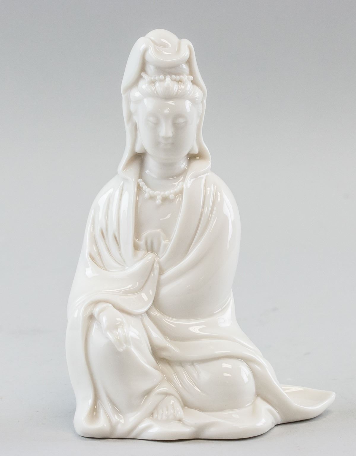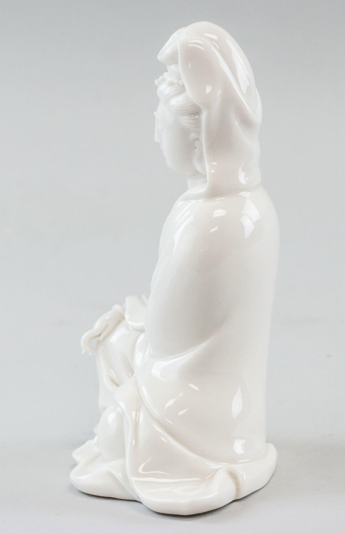 Chinese porcelain statue. Of white tone. Featuring Guanyin seated on the ground. Two faint marks on back, near base. 17 x 21 cm, 421 grams.