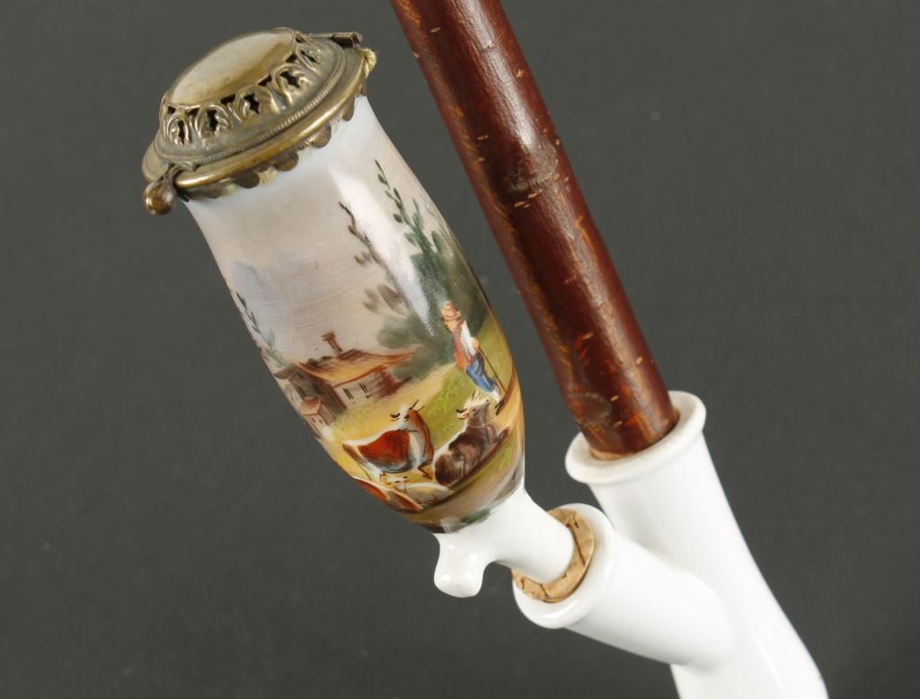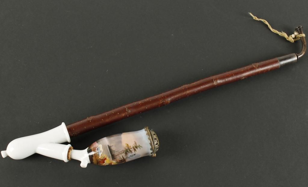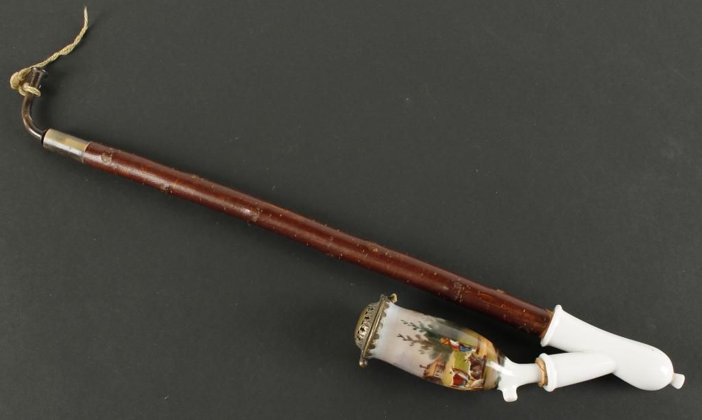 Brass lid, wood stem, horn tip, very good condition, measures approx 14 1/2" overall.