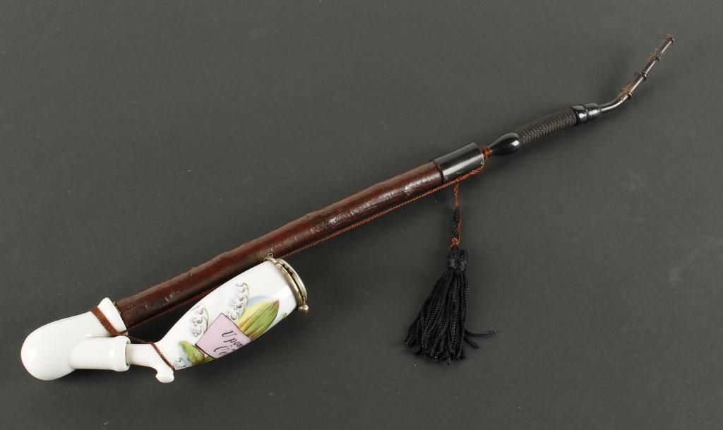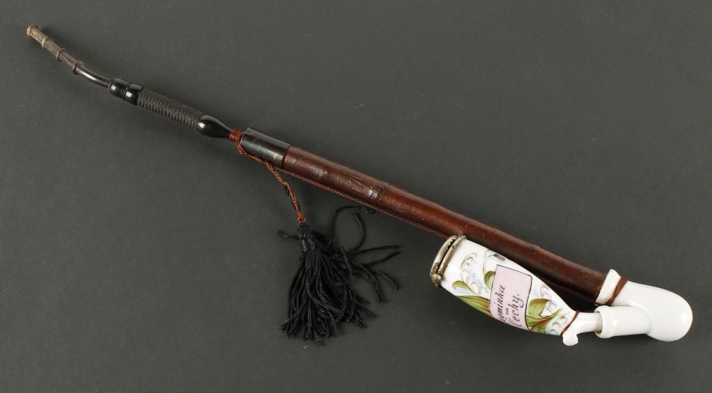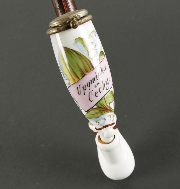 "Upominka na Cechy" on front, metal lid, wood and horn stem, measures 17 1/2" overall.