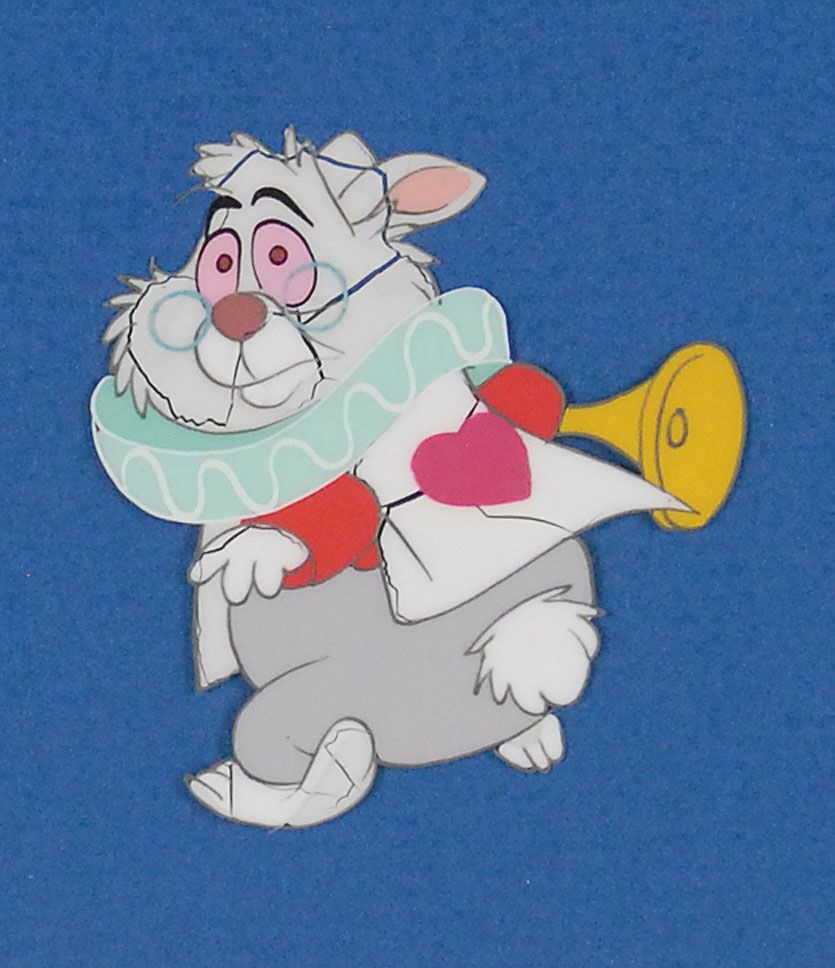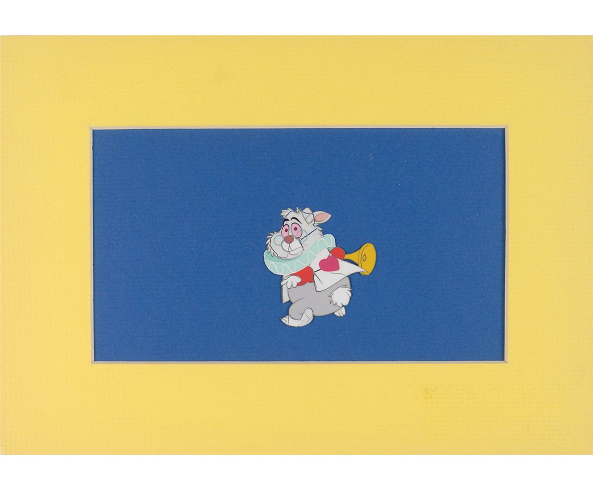 (Walt Disney Studios, 1951) Original production cel featuring the White Rabbit from Alice in Wonderland. Image measures 2 x 2.25, with a mat opening of 7.25 x 4. Mat dimensions are 10.5 x 7.5 Some cracking to the paint, otherwise fine condition.