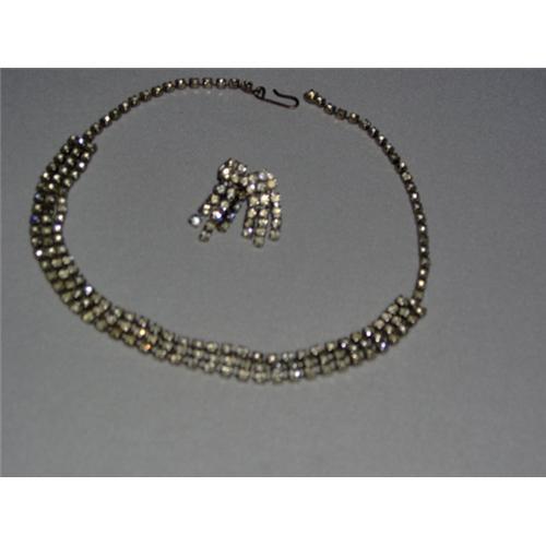 The necklace is a three-strand choker style and is 16 inches long, inclusive of fastening ends. The ends themselves are also studded with the rhinestones! The earrings are each 1 1/2-inch long with a three-strand drop design and screw backs. The white rhinestone sets in these pieces are square in shape.<p>