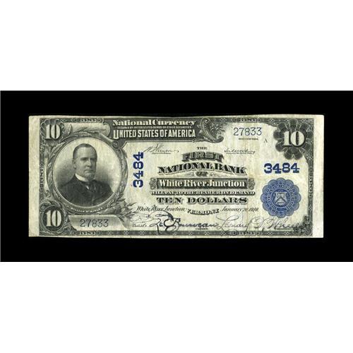 <B>White River Junction, VT</B></I> - $10 1902 Plain Back Fr. 627 <B>The First NB</B></I> Ch. # 3484<BR>This <B>Very Fine</B></I> note bears the second of two titles under which this bank issued.<BR><BR><b>Shipping:</b> Coin/Currency (<a target="_blank" href="http://www.heritageauctions.com/common/shipping.php">view shipping information</a>)