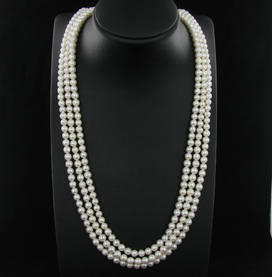 Excellent white saltwater pearls; uniformly sized (6.5mm); 330 count; 75" (25" 3 strands); $2995 retail