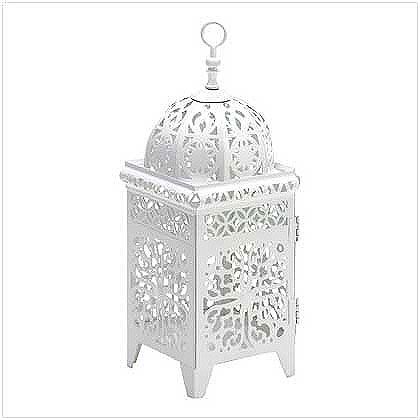 White Scrollwork Candle Lantern **|**|** White Scrollwork Candle Lantern Bright white and intricate floral filigree add fresh appeal to this birdcage lantern! As candlelight shines through the cutout panels in a kaleidoscope display, your porch or patio comes alive with jubilant points of light! Metal. Candle not included. 4 1/4 diameter x 10 3/4" high. 1 EA (WFM-38332)