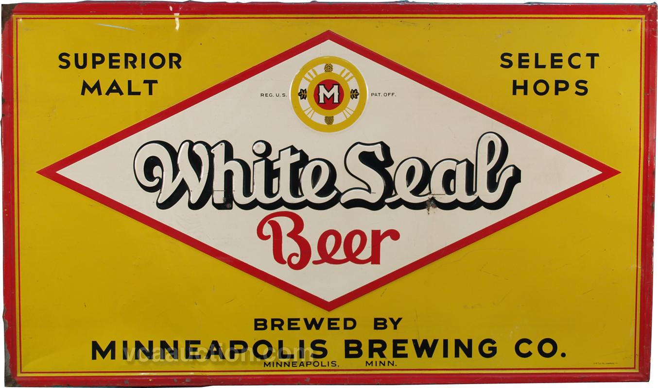 White Seal Beer Self-Framed Embossed Tin Sign, Minneapolis Brewing Co. c1951 - 58" x 34"