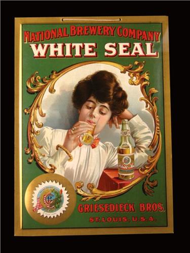 White Seal Brewing Co. Griesedick Brothers, St. Louis, USA, Celluloid Sign. String hanger with beveled edges. The Whitehead and Hoag Co., NJ lithographers. Framed under glass, near mint condition. 10 X 14 inches.