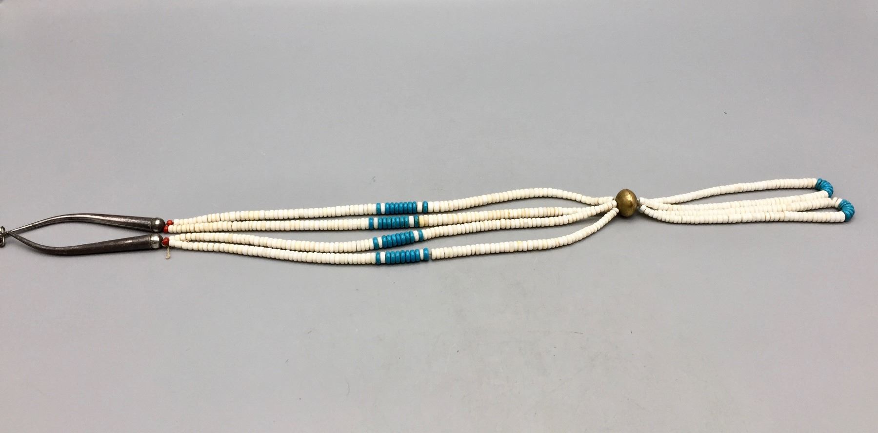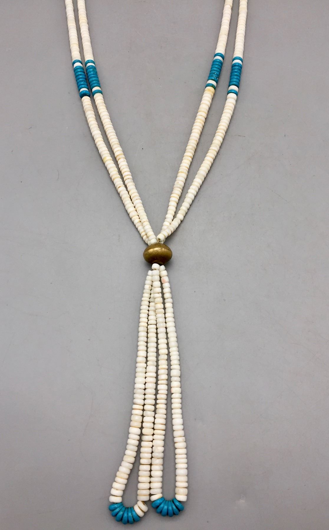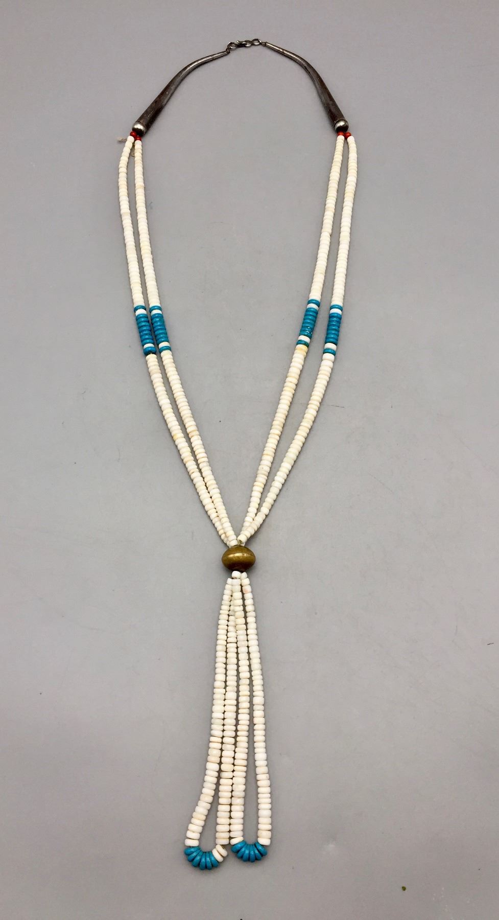 Description: Offered for bidding in this lot is a white shell and turquoise necklace that appears Pueblo in style. The necklace includes a brass accent and sterling silver findings. Maker: Unknown. Approx. Age: Vintage. Size: Fits a 30” neck. Weighs 119.6 grams. Condition: Good for its age, normal wear expected. Please look closely at the pictures - they are an important part of our description. Shipping: There will be a $5 handling / packaging fee for shipping this lot. The actual cost of postage will be added on top of that.