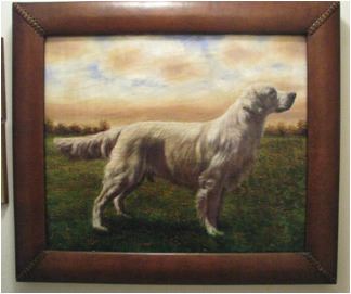 Designed to look like a Centuries old & crackled heirloom , this original oil painting of a magnificent White Shepherd dog reminds us of the portraits that the Aristocracy often commissioned for their Country homes in the 18th and 19th Century Europe. It is framed in a handsome, handmade leather molding manufactured in South America. The frame is in excellent condition. “White Shepherd” measures ____ x ____including the frame.