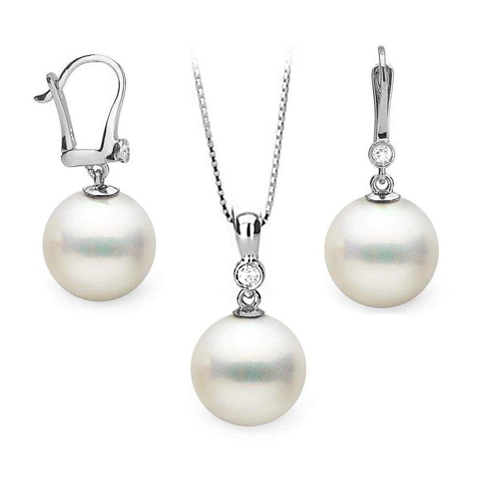 White South Sea Pearl and Diamond Bezel Pendant and Dangle Earring Set