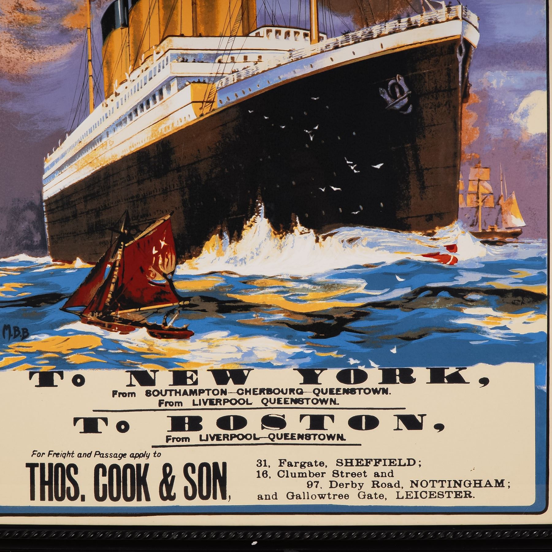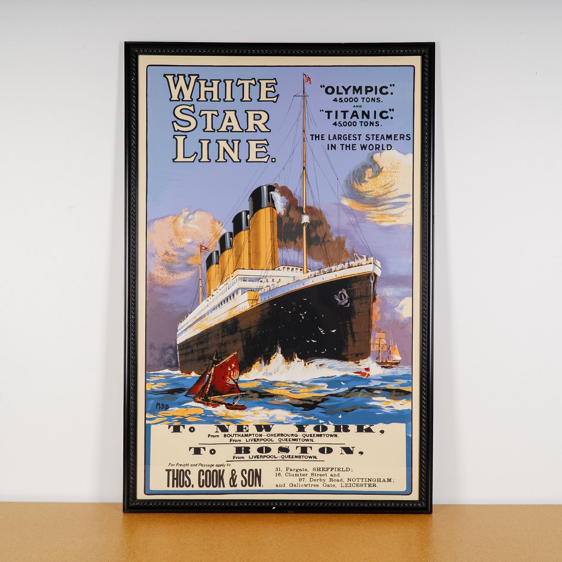 Vibrant lithograph on paper applied to board after the legendary White Star Line advertising poster, originally created to promote the grand transatlantic liners Titanic and Olympic. Featuring striking imagery of a colossal ocean liner cutting through the waves, the poster proudly proclaims these ships as the largest steamers in the world, each weighing 45,000 tons. Commissioned for Thos. Cook & Son, this reproduction was likely produced in the mid-to-late 20th century, bringing the historic design back to life for collectors and admirers of maritime history. The framed presentation enhances its display appeal, making it an excellent piece for collectors of ocean liner memorabilia and Titanic enthusiasts alike.