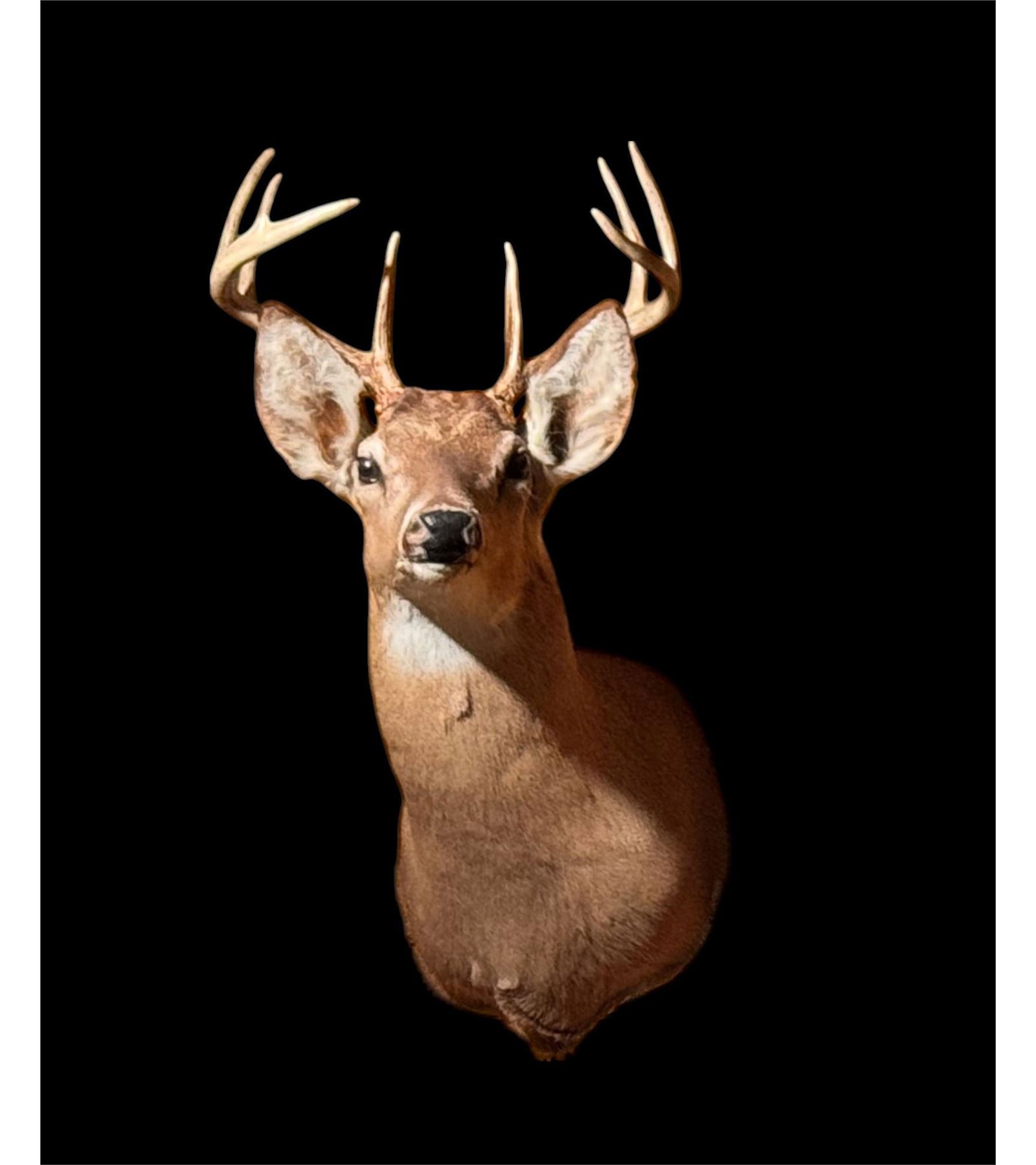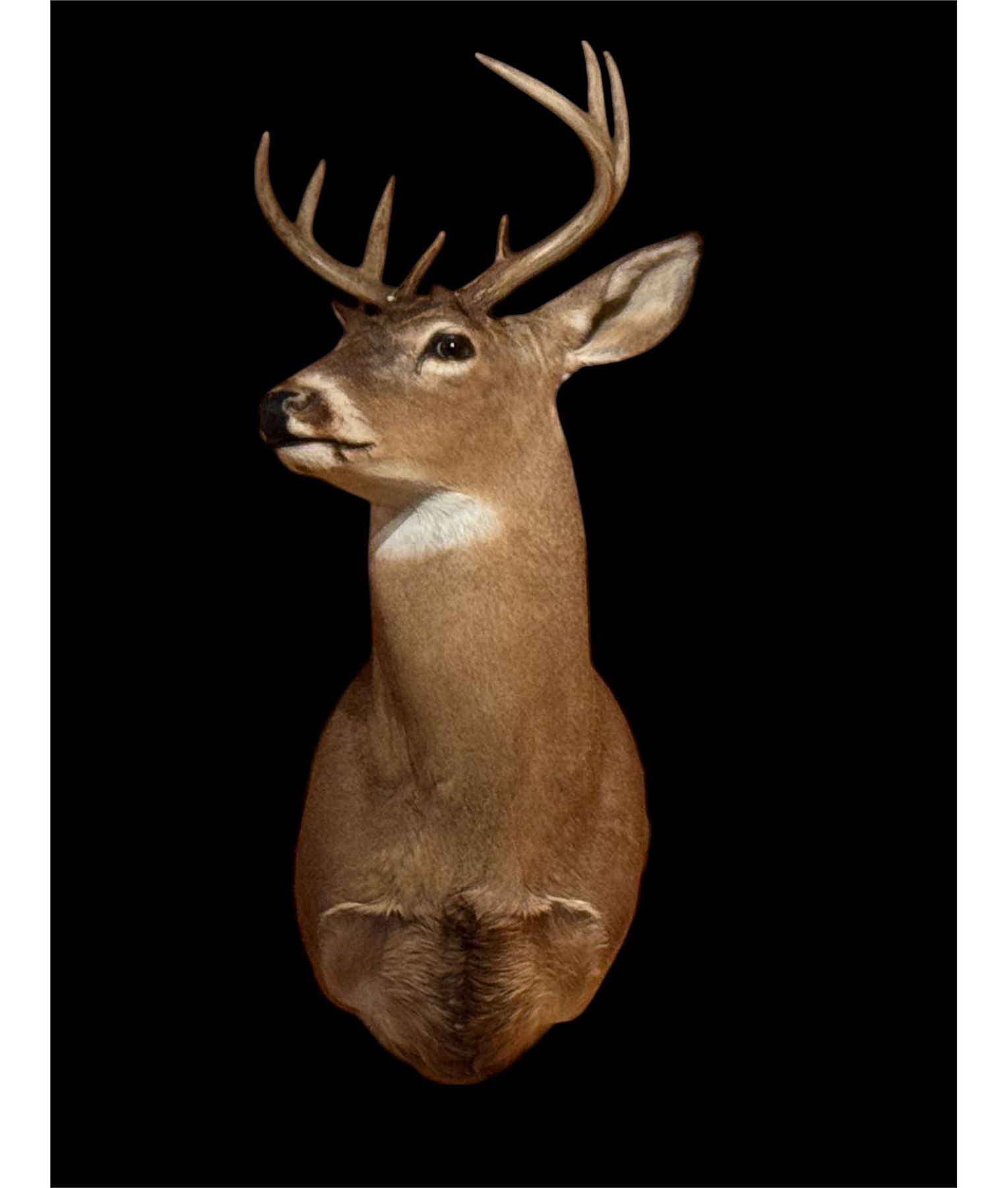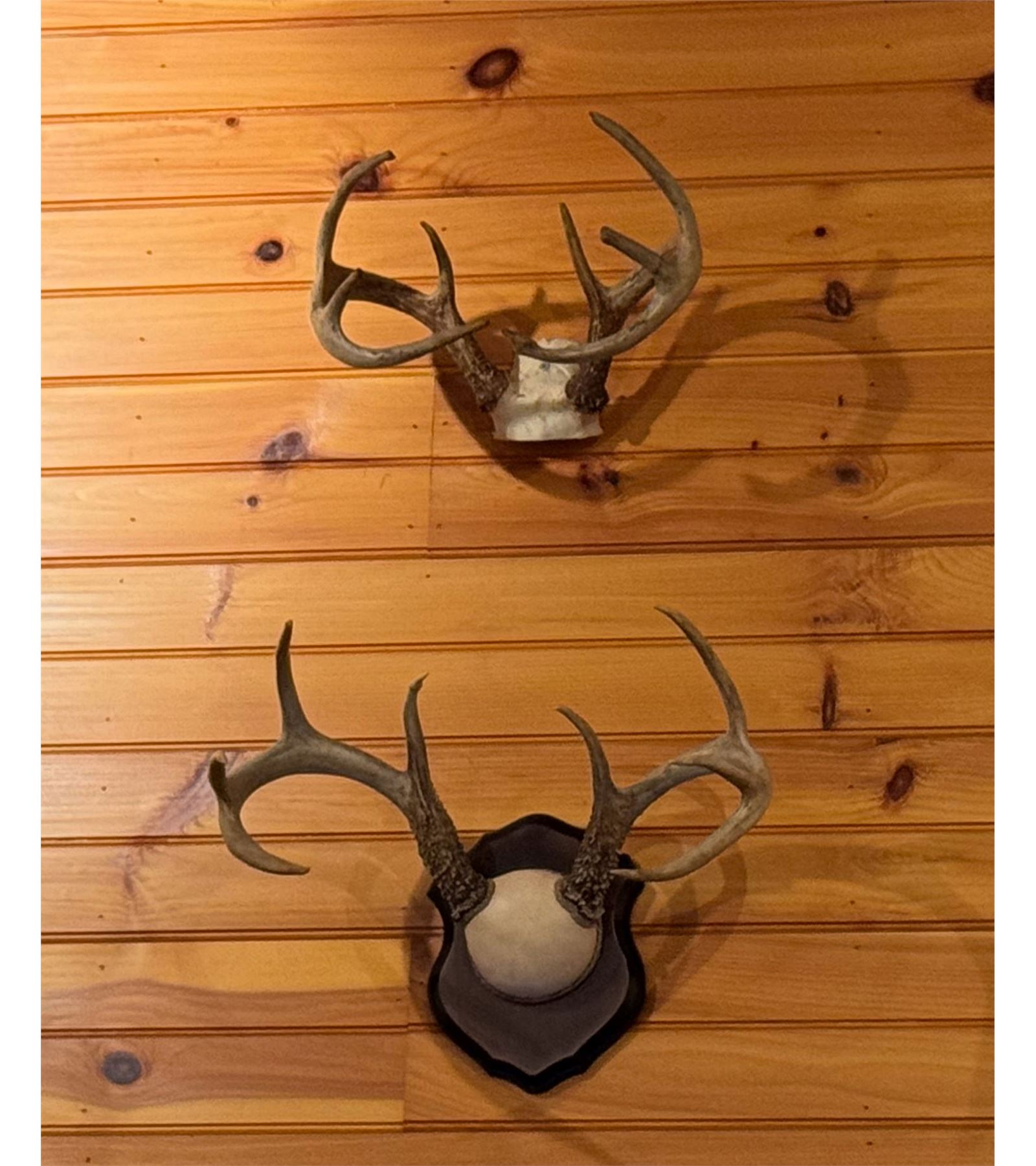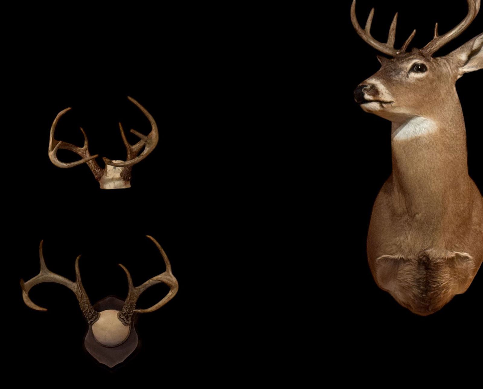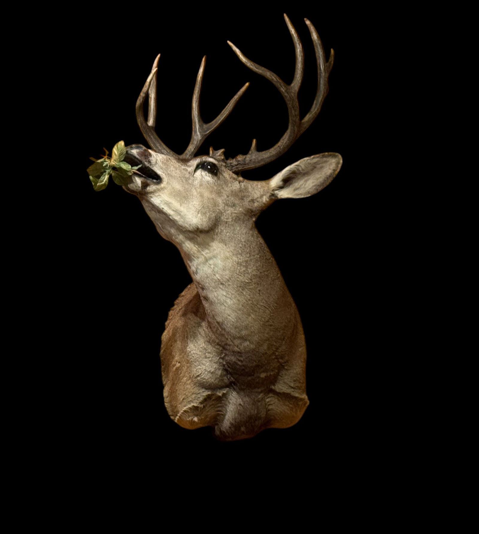 White tail deer shoulder mounts w/ antlers. One is a mule deer mount. Taxidermy.