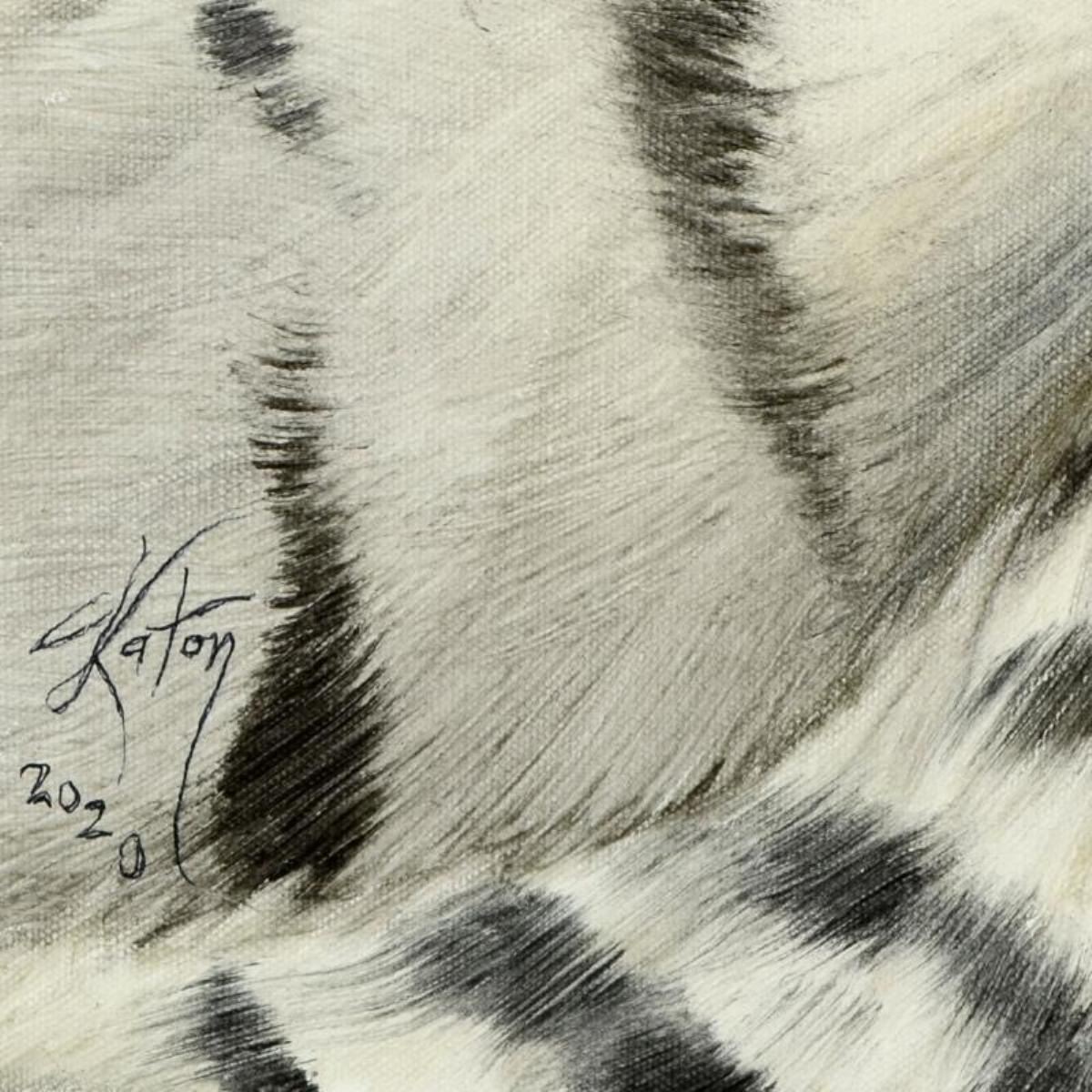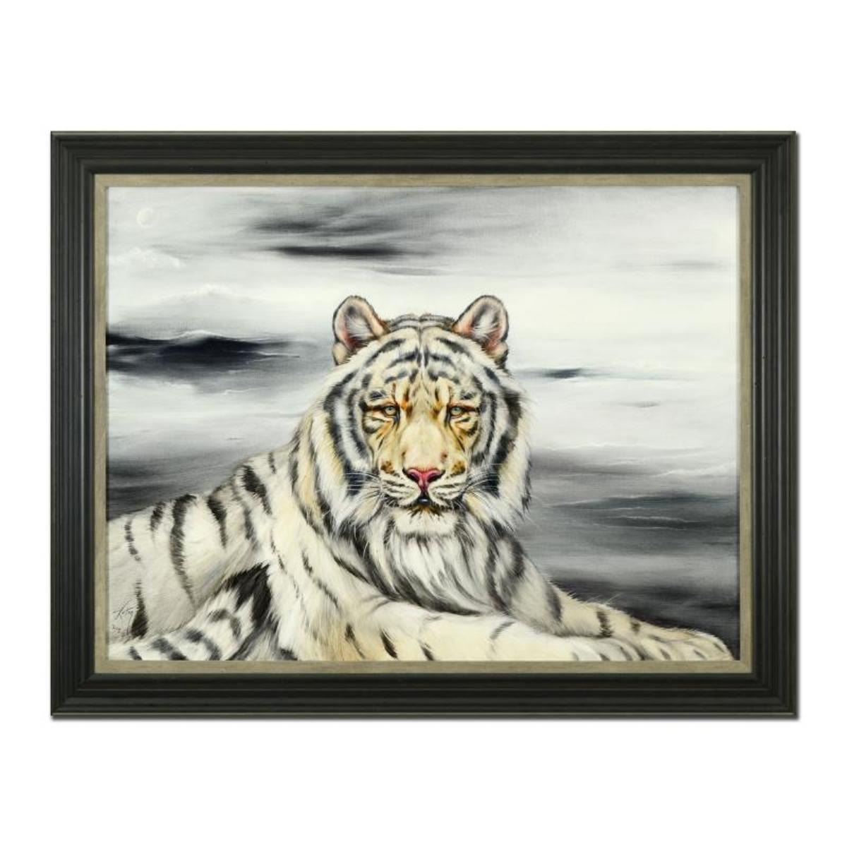 White Tiger by Katon Original. "White Tiger" is an original oil painting on canvas by Martin Katon, hand signed by the artist. This piece comes framed. Includes Letter of Authenticity. Measures approx. 47" x 37" (framed), 39.5" x 29.5" (image).