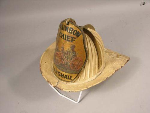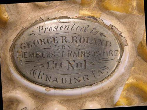 White with gold fire helmet - 8" leather front piece, hand painted depicting steam pumper for Rainbow Chief Marshall. Presentation plaque on brim "States" to George R. Rolland, by members of "Rainbow Fire Co #1, Reading, PA. 1773. Cracking on front brim, fair to good cond.