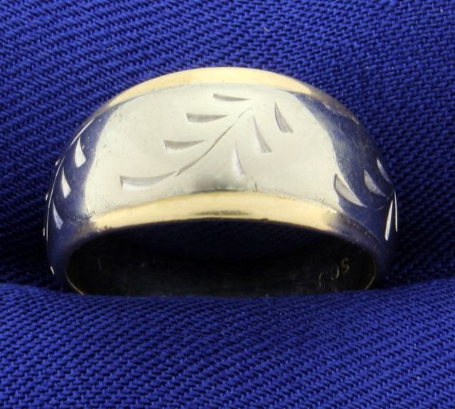 In 14k White and Yellow gold. Hand engraved with leaves/beautiful nature patern. Band is 10mm wide in front, tapers to 5mm wide in back of ring. Size 7. 6.6g