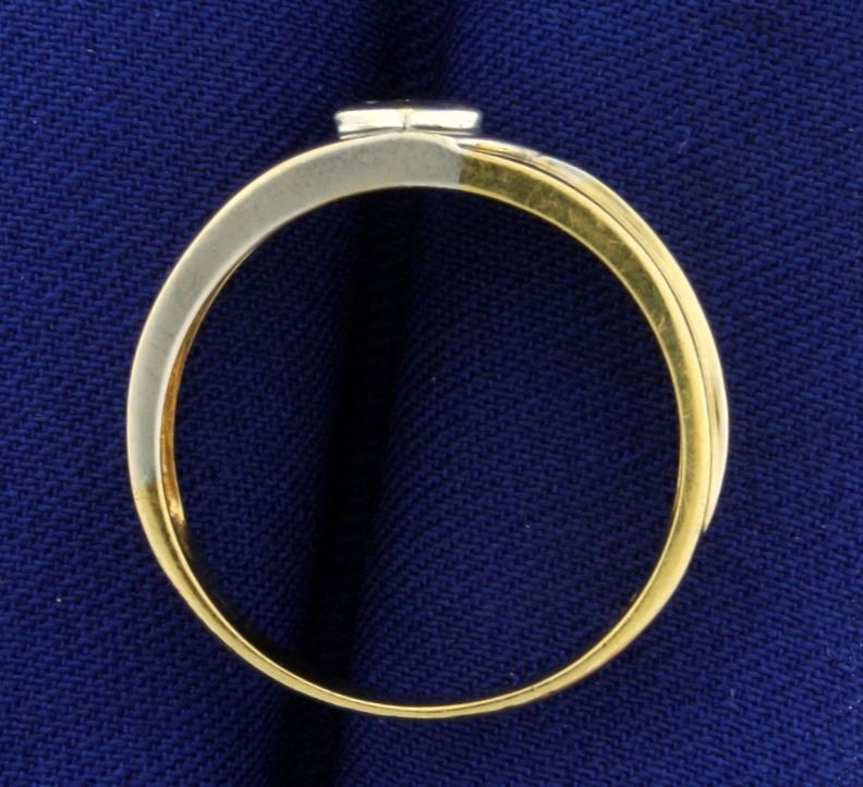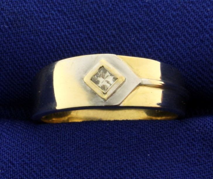 In 14k yellow and white gold. Contains a high quality .1 ct princess cut diamond, SI clarity/I color. Size 8 3/4 and 4.8mm wide. 3.8g.