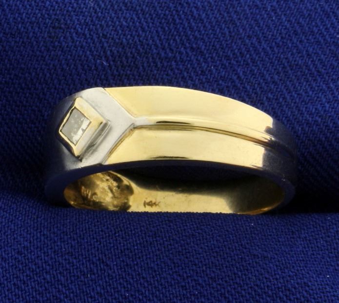 In 14k yellow and white gold. Contains a high quality .1 ct princess cut diamond, SI clarity/I color. Size 8 3/4 and 4.8mm wide. 3.8g.