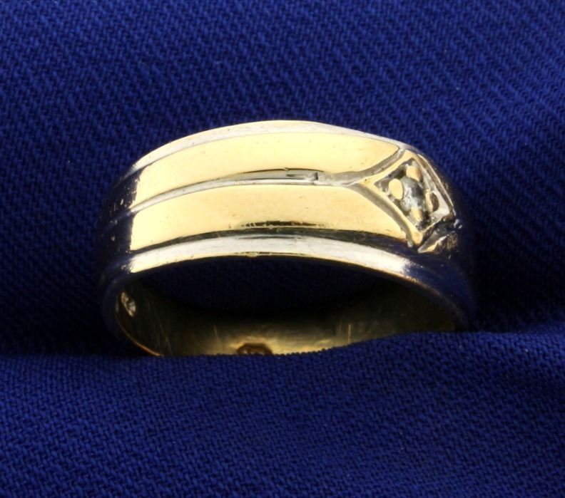 In 14k yellow and white gold, containing a high quality .05ct diamond. H color/SI clarity. Size 7. 6.4g.