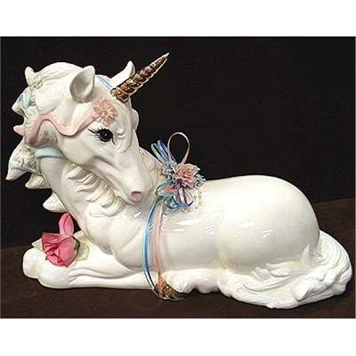 White glazed Unicorn with golden horn and hooves. Stands 9 3/4" tall and measures 15" long. No chips or cracks. Some of the flowers could be refreshed or replaced to liven it up a bit. Pretty piece