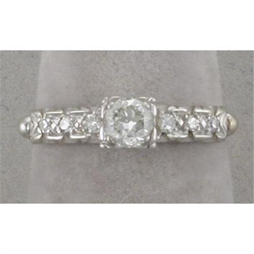 Pretty (marked) 14K . 18K white gold ring, circa 1947. Set with seven diamonds, the center stone is estimated to weigh approximatley 1/4 carat and the six side stones are estimated to add another .10 carat, for over a 1/3 carat total diamond weight. It is a size 5 and weighs 1.9 grams.