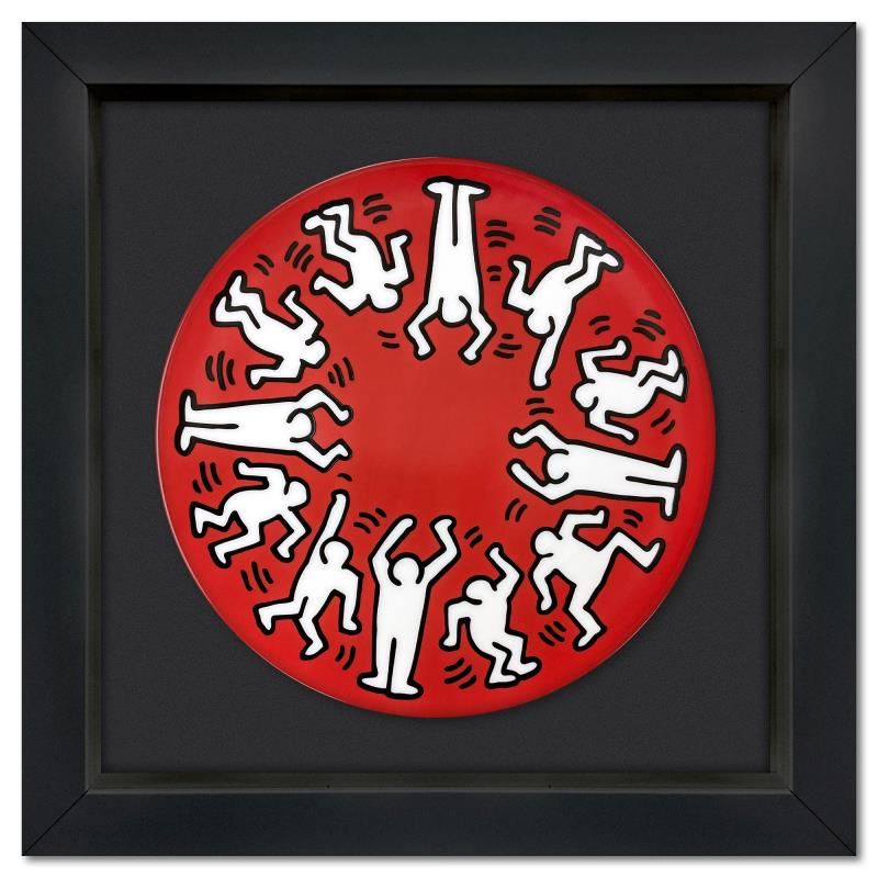 "White on Red" is a Limoges porcelain plate bearing the plate signature inverso of Keith Haring (1958-1990). This plate is custom framed and floated on linen. Measures approx. 16" x 16" (frame) 11" (plate diameter).