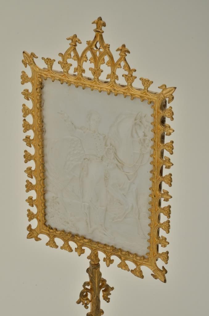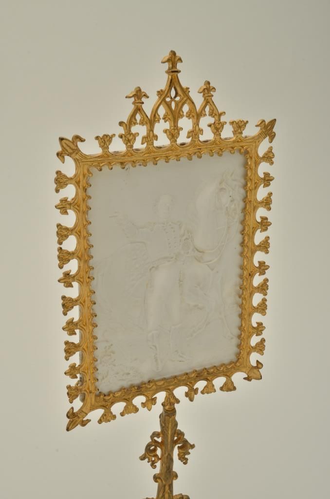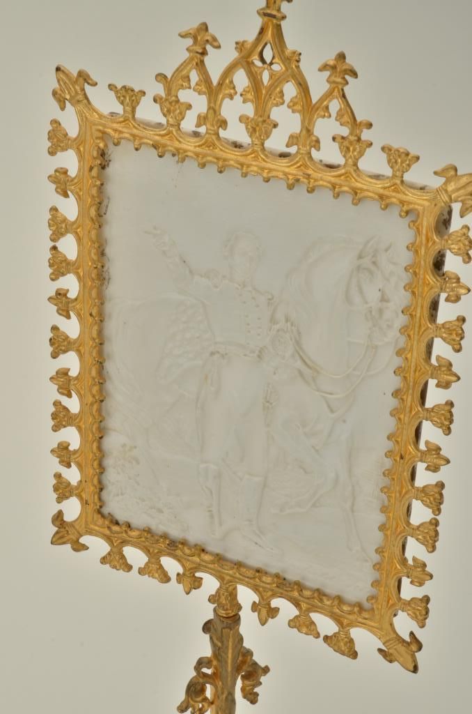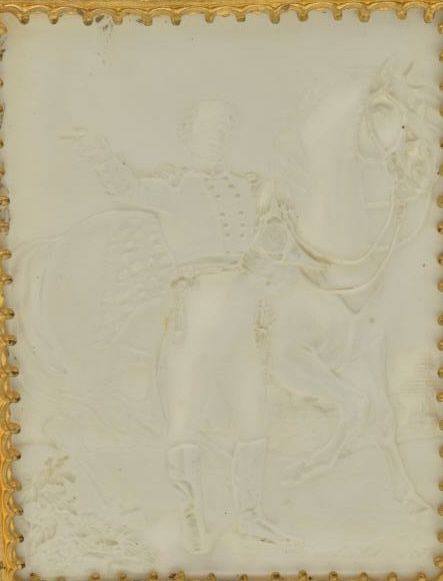 White porcelain Lithopane of General of the Army Winfield Scott with original gold gilded brass two piece fancy stand. The porcelain image measures approximately 7 ½”x 6 ½” The stand measures 19” in height. The image shows a young General Winfield Scott before the Civil War. The condition is fine to excellent. Est.: $300-$600.