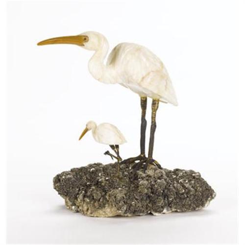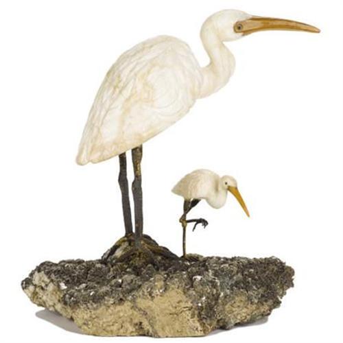 <B>White quartz crane and chick on base of iron pyrite<BR></B></I>George Wild<BR>White quartz <BR>8-1/2 x 6-1/2 inches (19.1 x 16.5 cm)<BR> <BR><BR><b>Shipping:</b> Requires 3rd Party Shipping (<a target="_blank" href="http://www.heritageauctions.com/common/shipping.php">view shipping information</a>)