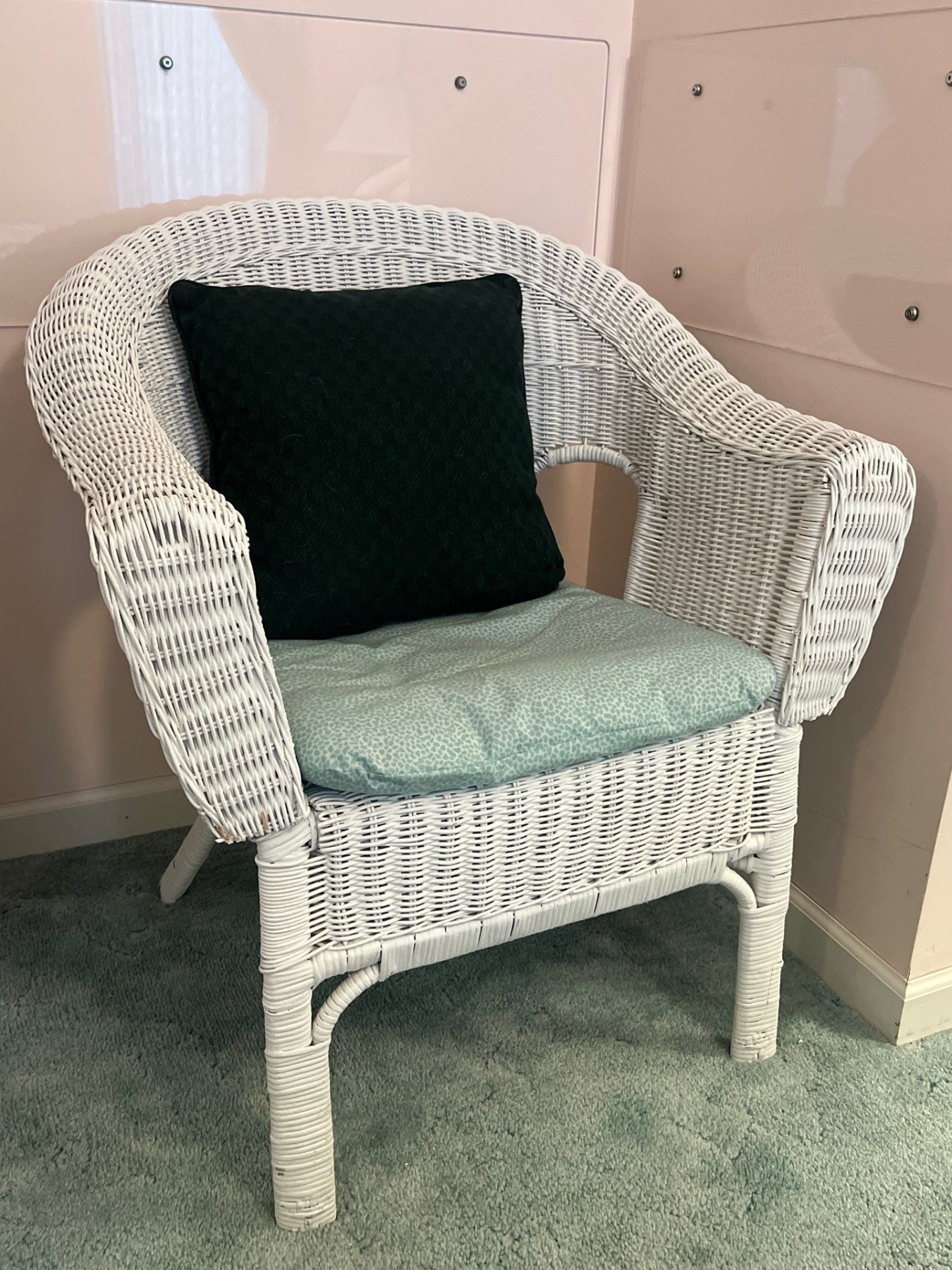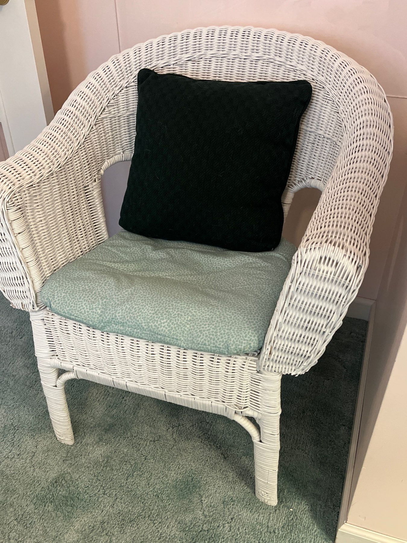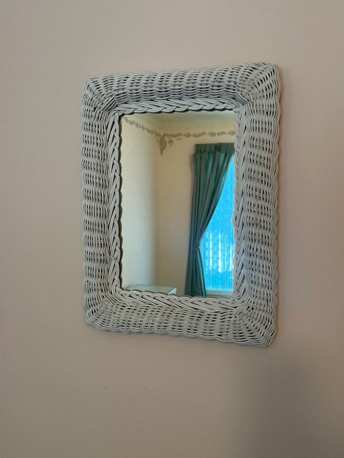 White wicker chair with a small white wicker mirror 16”x 12” in great condition