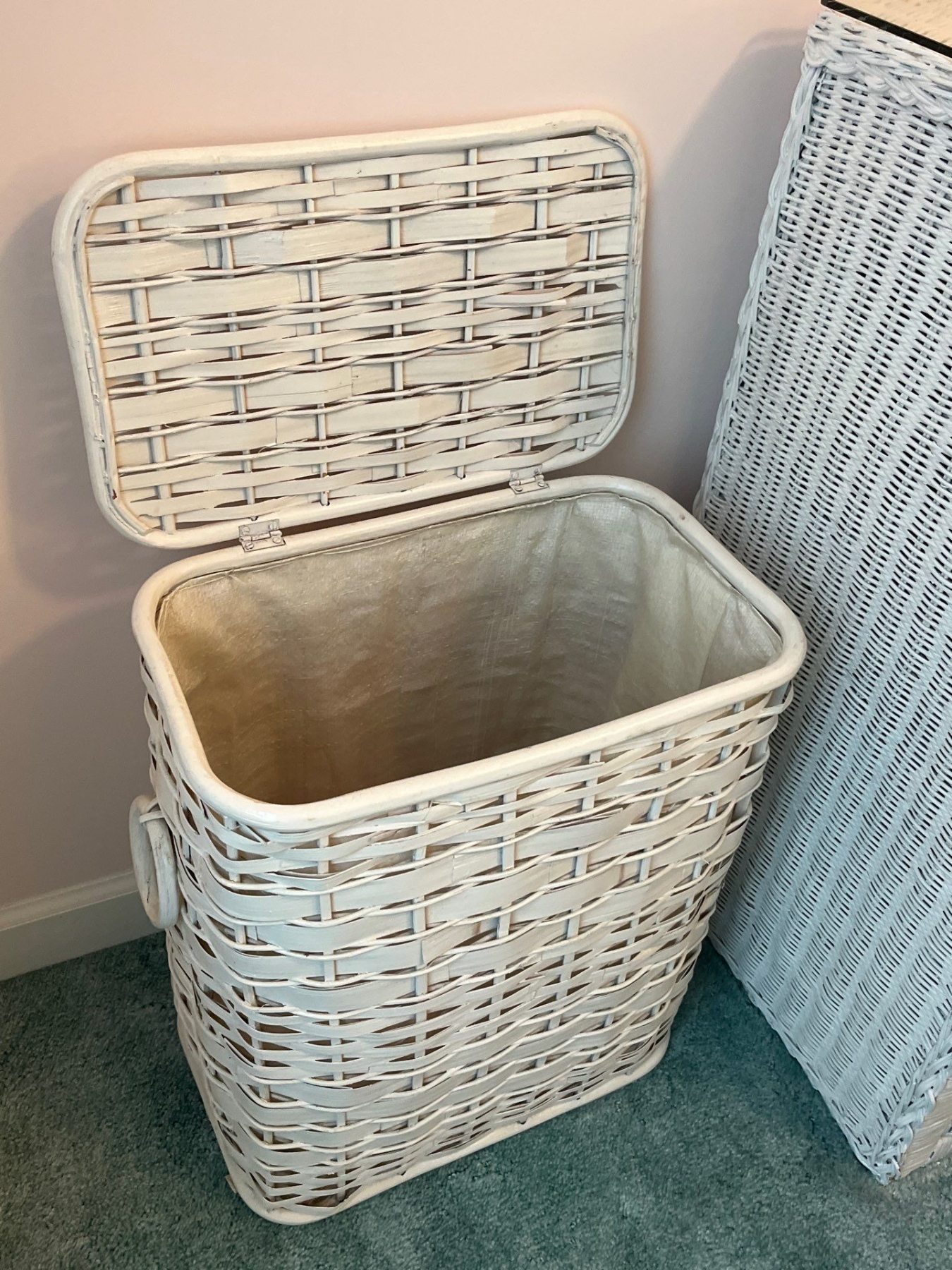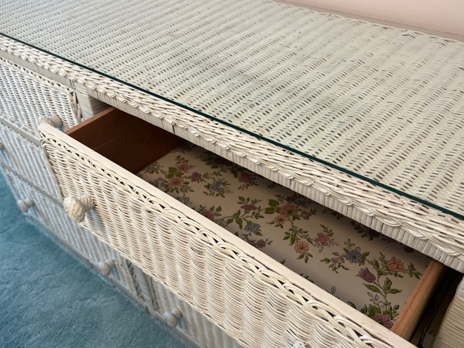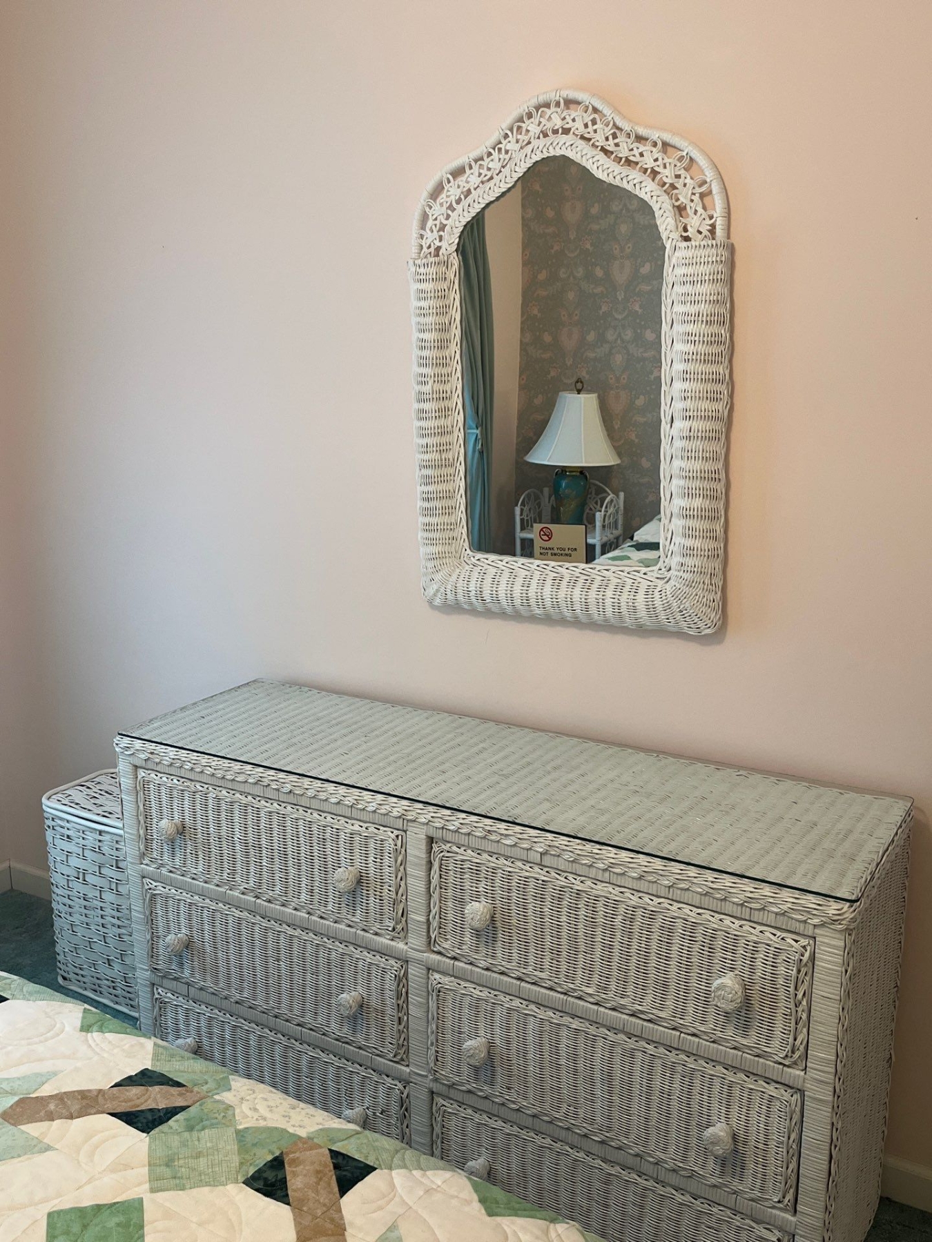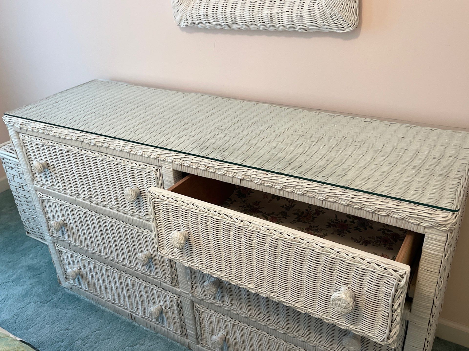White wicker dresser with white wicker mirror and laundry hamper all matching in great condition. Dresser also includes a full glass top. Length 53” height 29” Width 16”