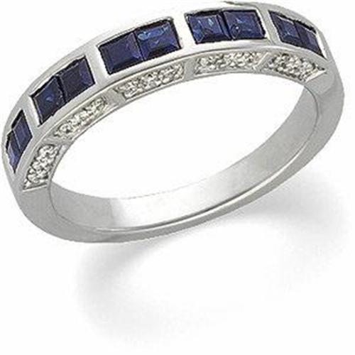 This 14k White Gold Wedding Band features 10 Princess Cut Genuine SAPPHIRES. The Sapphire Total Weight = 1.20 CARATS! There are 15 'Sparkling' Diamonds set each SIDE of the Sapphires, and the Diamond Total Weight = .15 Carats! This beautiful Sapphire & Diamond Wedding Band is 3MM wide, and it is a Size 6 and it can be resized.