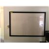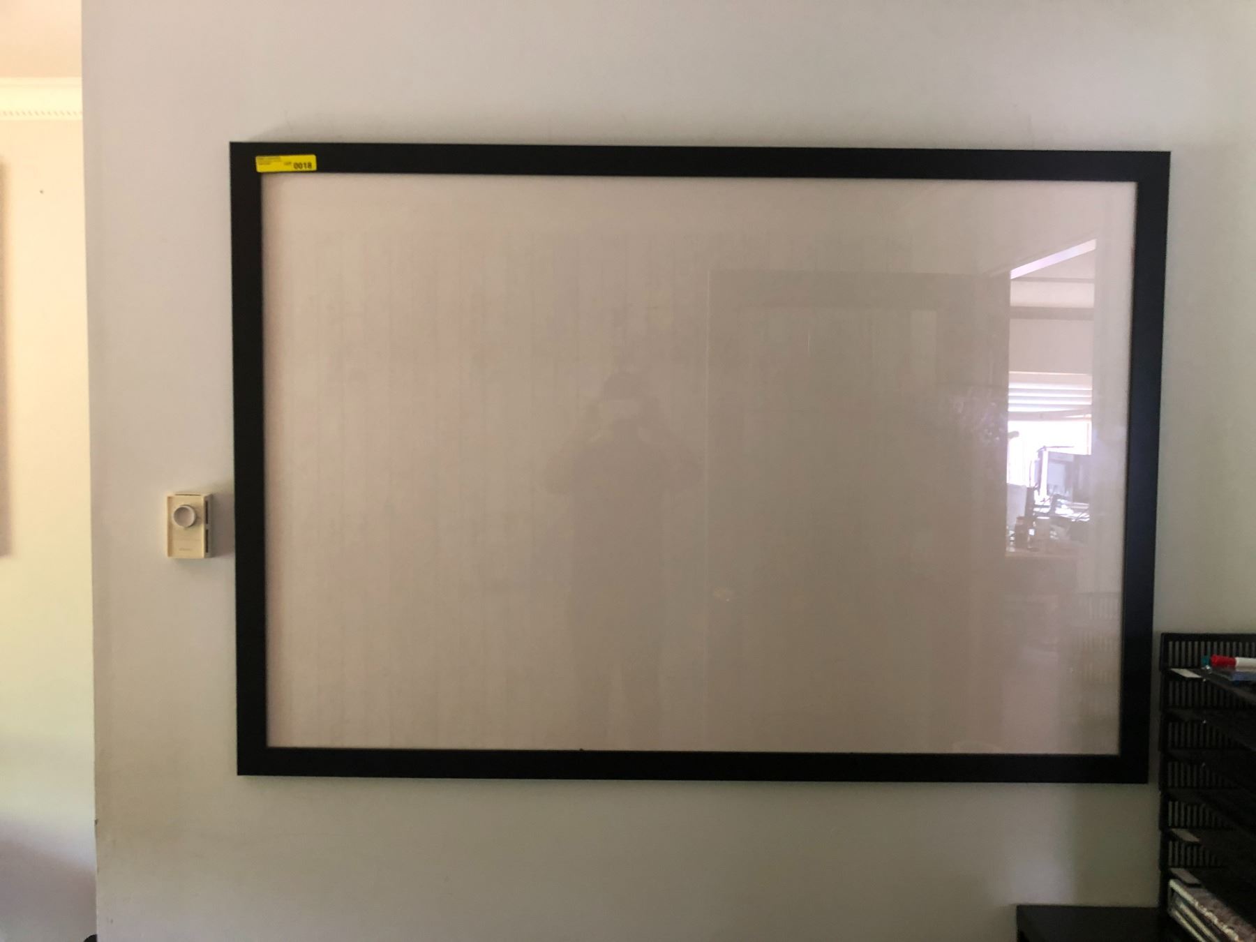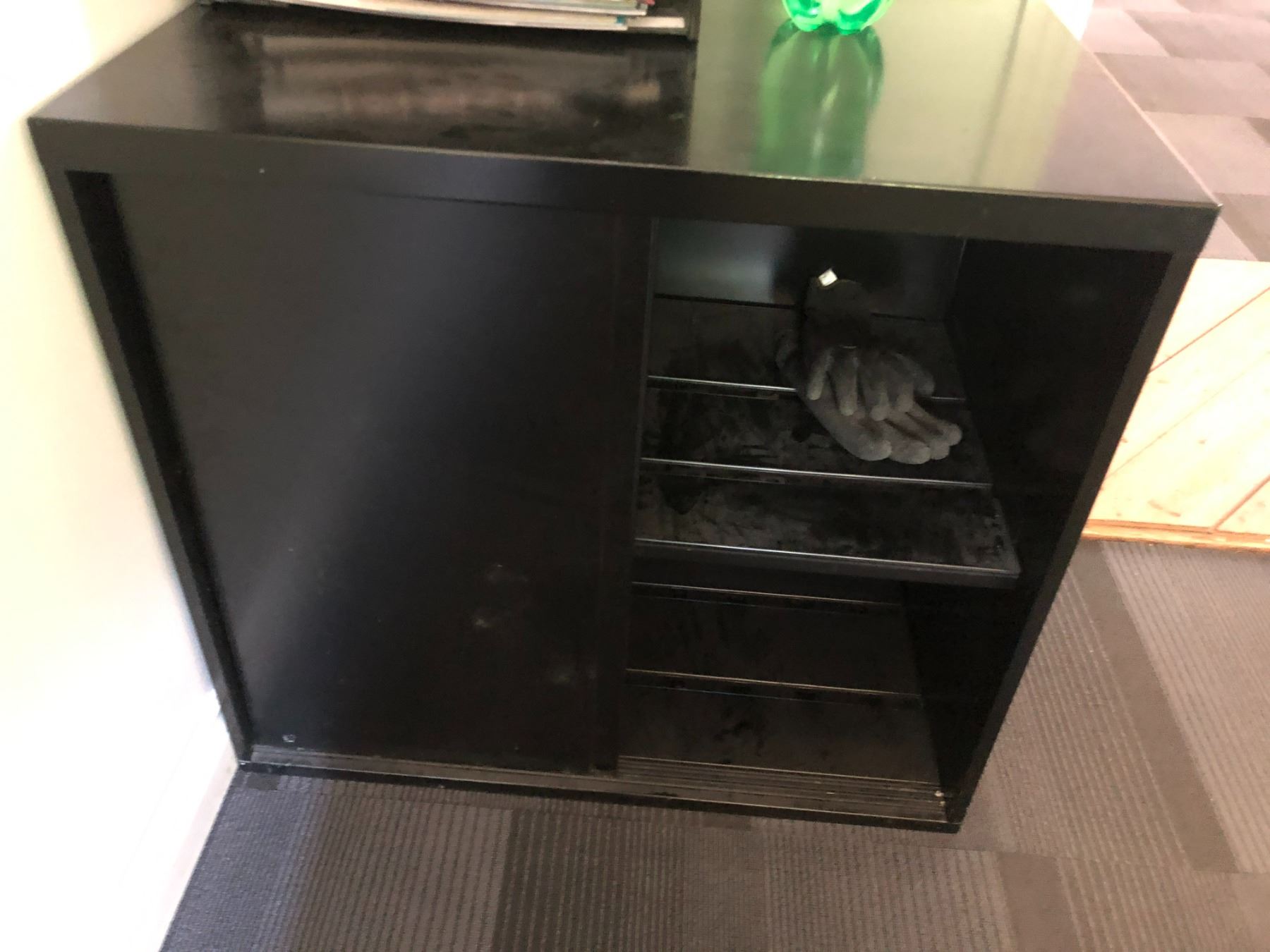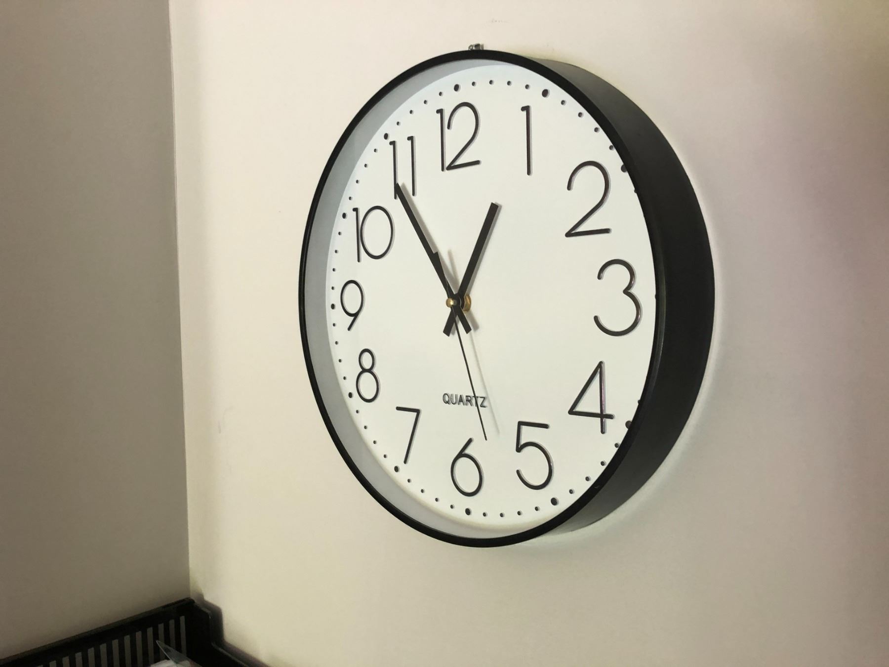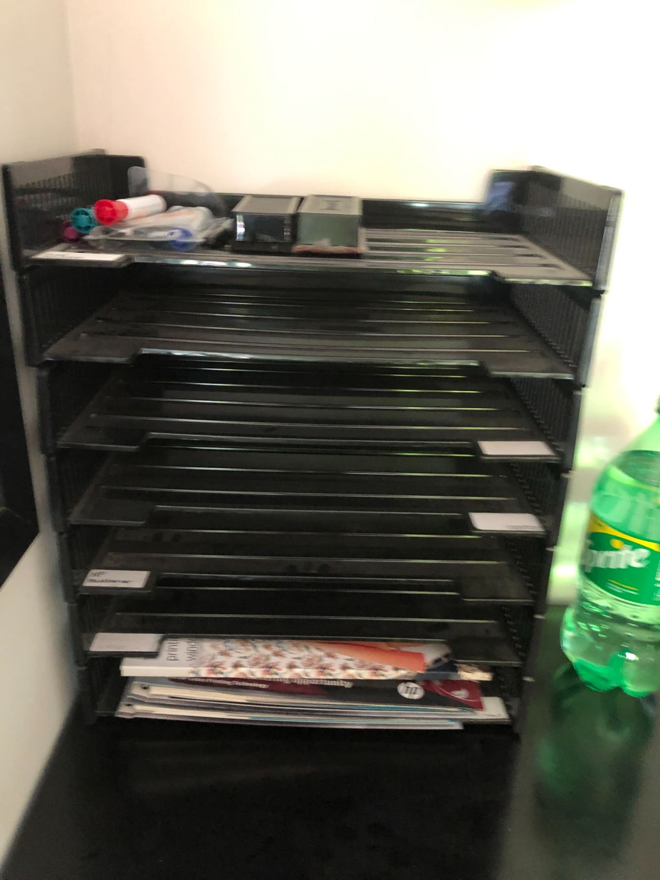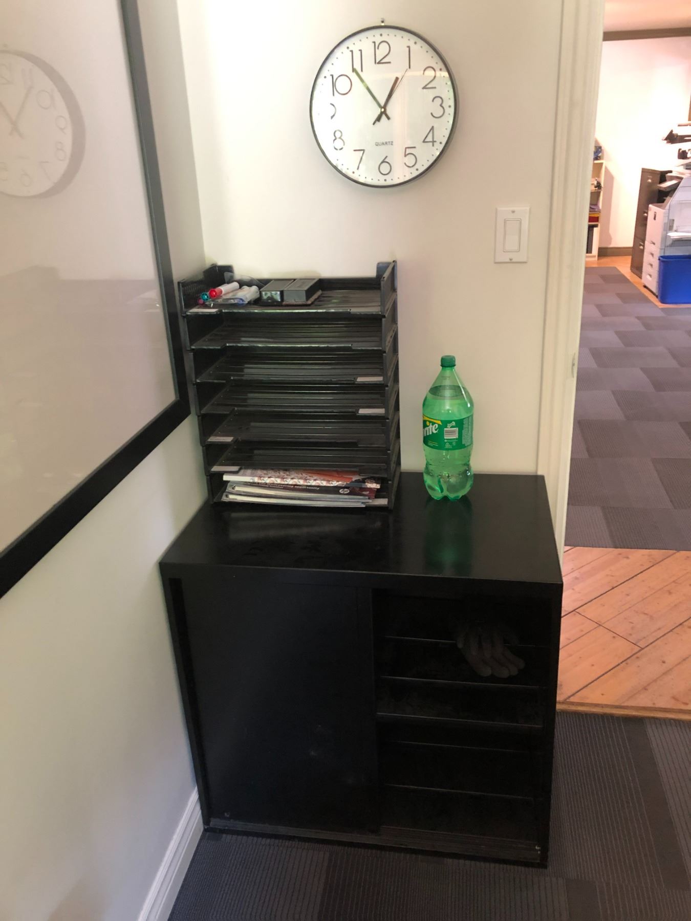 Whiteboard, a filing cabinet, a files organizer, and a wall clock