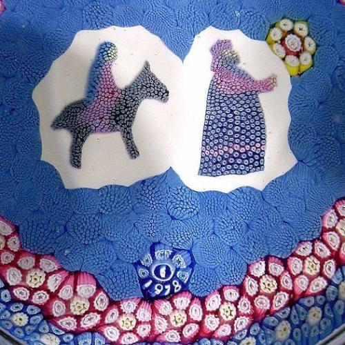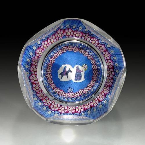 Whitefriars 1978 faceted Mary and Joseph millefiori paperweight. A portrait cane of Mary and Joseph, rests on a blue carpet ground, bordered by two concentric rings of complex millefiori. Signature/date cane. Edition #276. Five and one facets. Diameter 3 1/8".