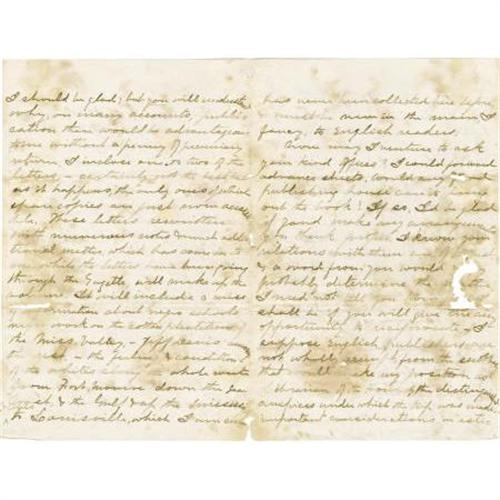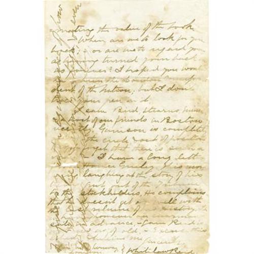 <B>Whitelaw Reid Autograph Letter Signed,</B></I> 4 pages, 5.25" x 8" "<I>Cin. Gazette Rooms, Washington, D.C.</B></I>", August 5, 1865, to a Mr. Conway asking for help in having a book published in London at the same time it is being published in the U.S. on the subject of "<I>a picture of the South emerging from the contest into which it plunged so boastfully</B></I>". Of course he is referring to the Civil War; the book's content "<I>will include a mass of information about negro schools, negro work on the cotton plantations of the Miss. Valley, - Jeff Davis among the rest...</B></I>" Condition is fair, with uneven toning and some paper loss affects the text. <I>From the collection of Henry E. Luhrs.</B></I><BR><BR><b>Shipping:</b> Flat Material, Small (<a target="_blank" href="http://www.heritageauctions.com/common/shipping.php">view shipping information</a>)