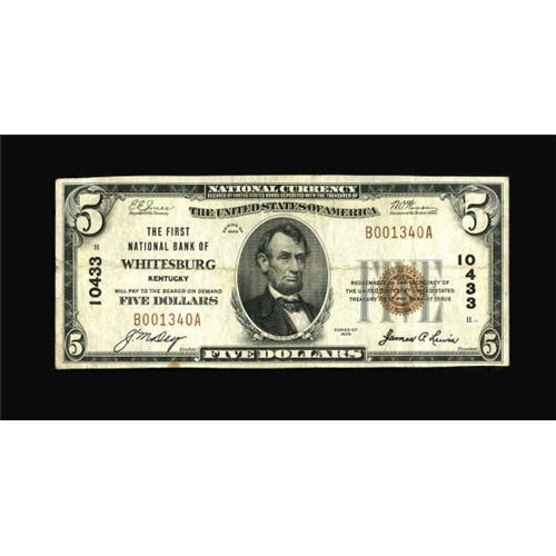 <B>Whitesburg, KY</B></I> - $5 1929 Ty. 1 <B>The First NB</B></I> Ch. # 10433<BR> A very scarce note from the only bank in town to issue. Only Type 1 examples can be found in small size, as the bank entered receivership in June of 1932. Pleasing <B>Very Fine, </B></I> with a tiny spot in the bottom margin mentioned only for the sake of total accuracy in cataloguing. <BR><BR><b>Shipping:</b> Coins & Currency (<a target="_blank" href="http://www.heritageauctions.com/common/shipping.php">view shipping information</a>)