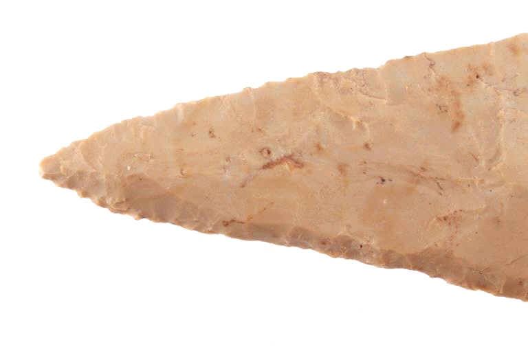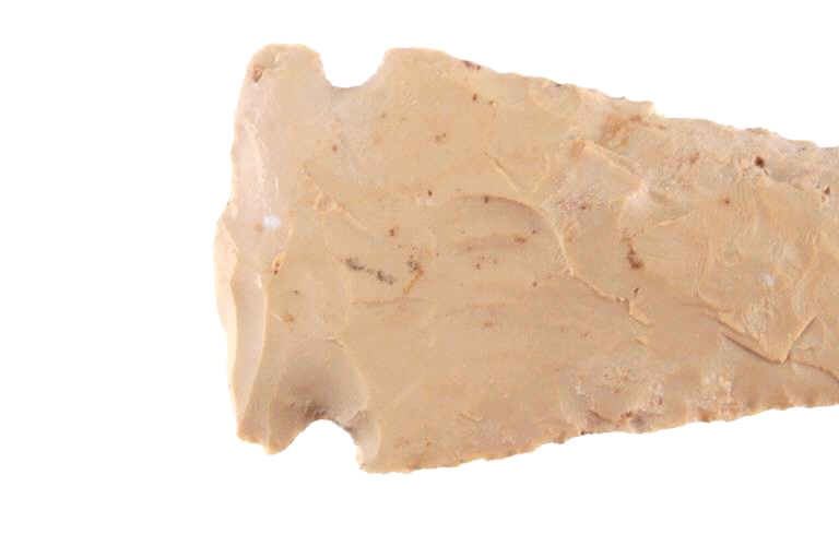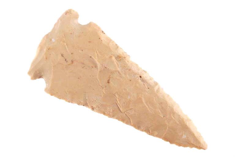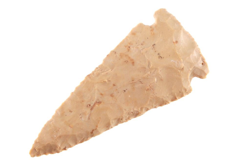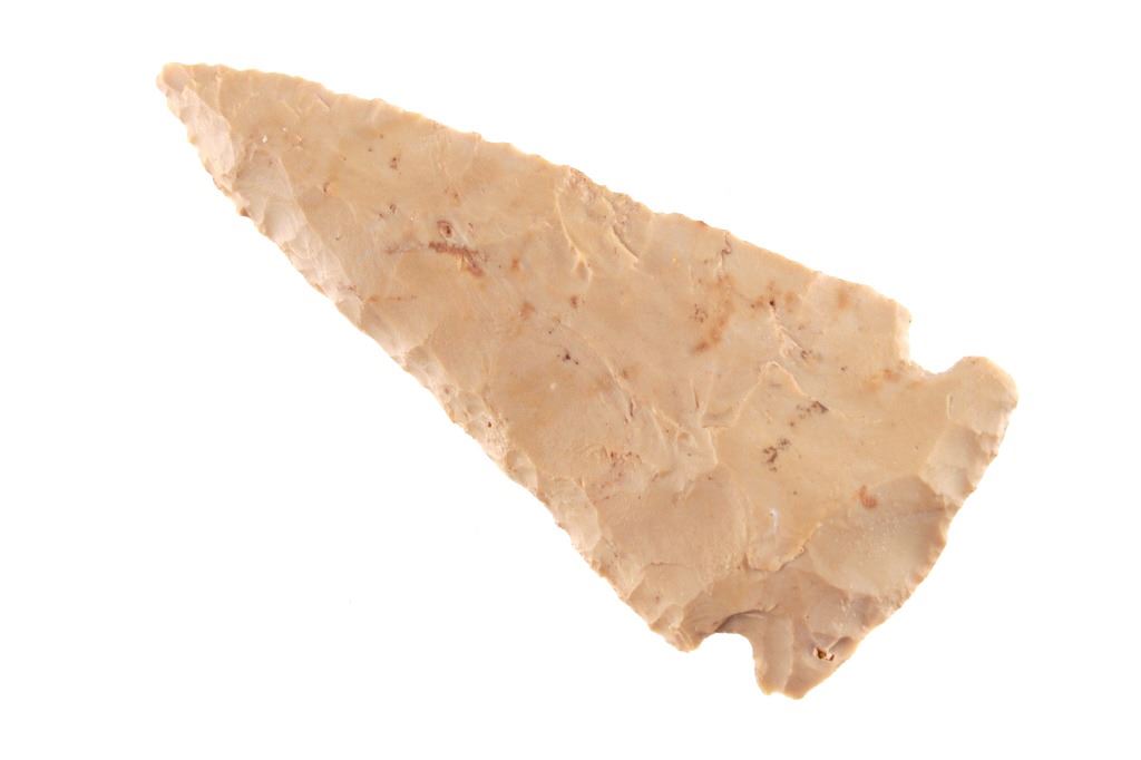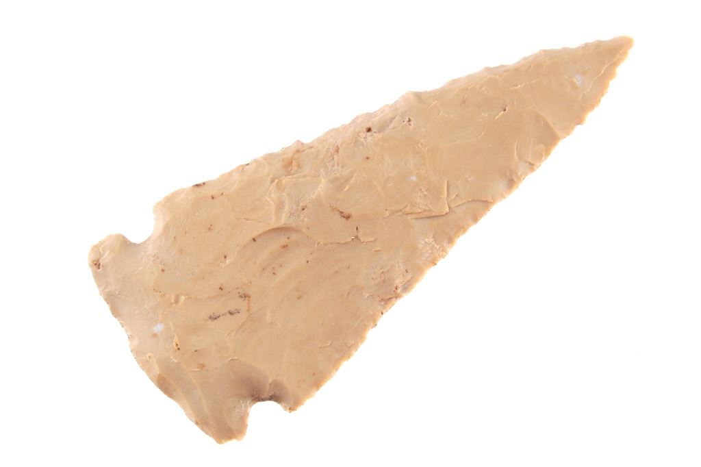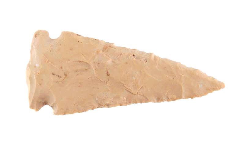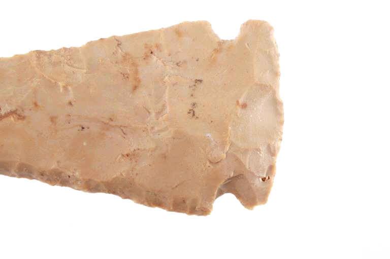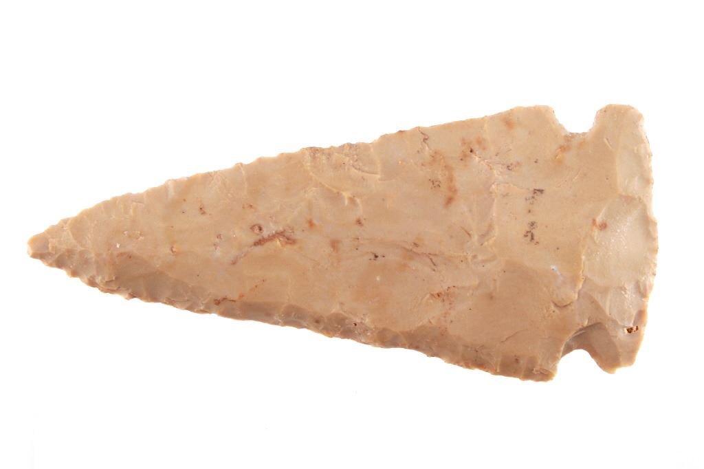 Featured in this lot is this Whiteshell side notch point and is dated from the Early Woodland period and circa 3,000 - 2,000 B.P. The point is a medium triangular point with side notches and an elliptical cross section and a slight excuvate blade. The base is convex with a roundish appearance. The point is napped from a light brown chert material. The condition of this point is good with no obvious signs of damage and in good overall condition. The measurements of this point are 4" x 1 3/4" x 1/2".