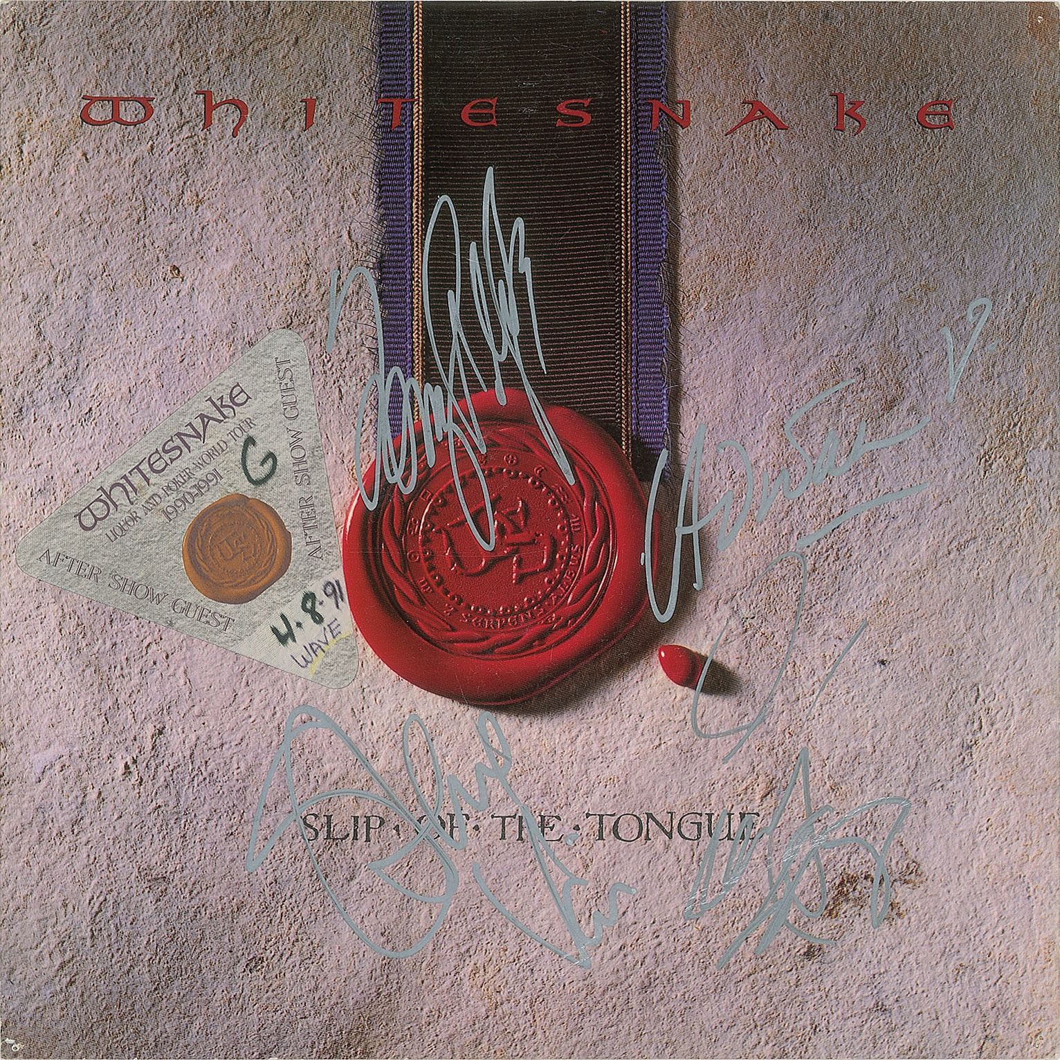 Slip of the Tongue album flat signed on the front in silver ink by Steve Vai, Adrian Vandenberg, Rudy Sarzo, and Tommy Aldridge. Album flat bears an affixed 'after show' guest pass from the 1990–1991 Liquor and Poker World Tour, marked "4-8-91, Wave." In very good condition, with some moderate creasing and tack holes to corners. The record is not included.