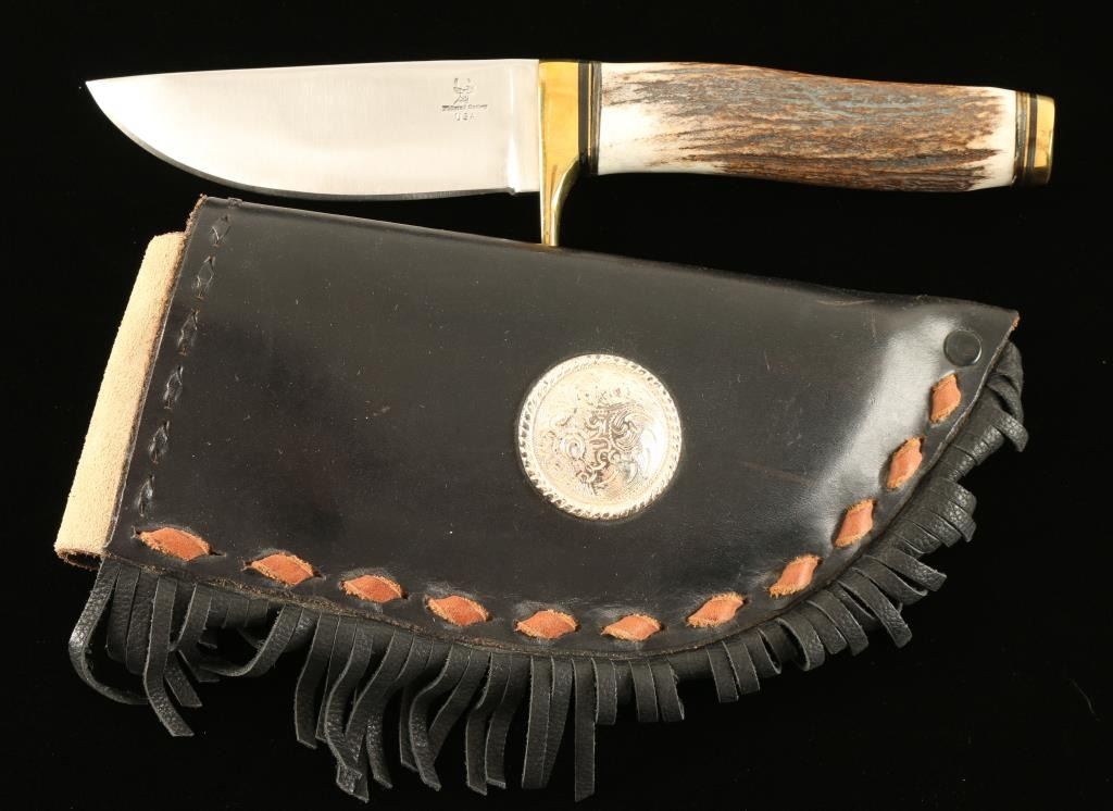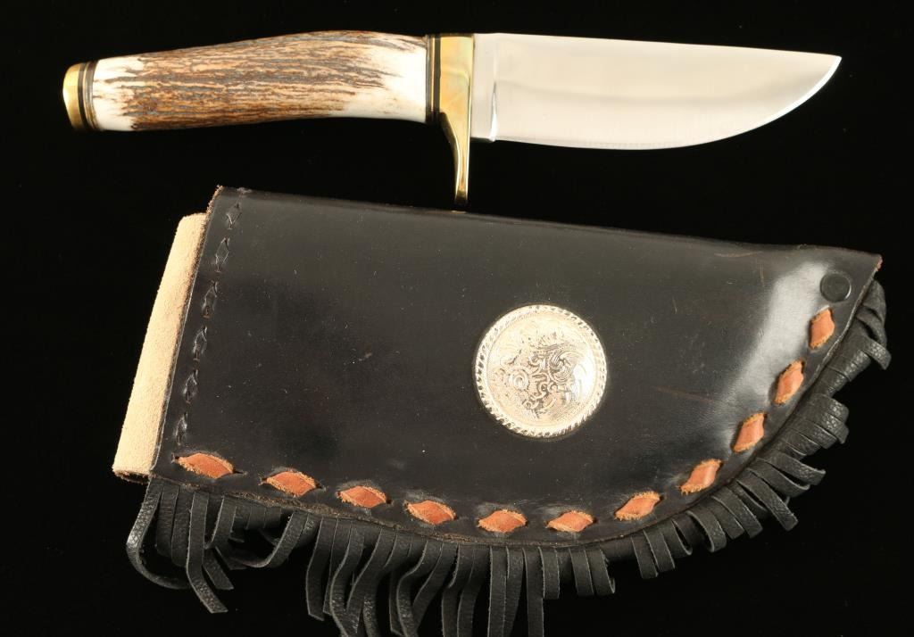 Featuring an antler handle and concho studded leather fringe sheath. Measures 9 3/4" overall with a 4 1/2" blade.