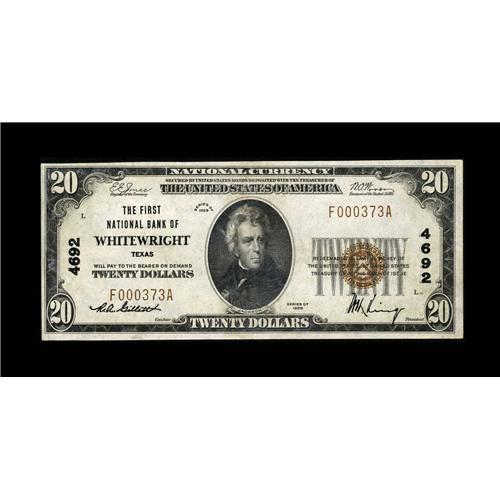 <B>Whitewright, TX</B></I> - $20 1929 Ty. 1 <B>The First NB</B></I> Ch. # 4692<BR>We sold a Fine example of this type and denomination at our September, 2004 Long Beach Signature Sale for $353. This <B>About Uncirculated</B></I> example with just the barest hint of a vertical center fold will do much better than that result, likely selling in the range of...<BR><BR><b>Shipping:</b> Coin/Currency (<a target="_blank" href="http://www.heritageauctions.com/common/shipping.php">view shipping information</a>)