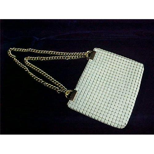 Whiting & Davis Co., Enamel Mesh Evening Bag. Gorgeous off white mesh bag measures approx. 8" x 7" and is complimented with a brass chain. Bag and lining are in very good condition.