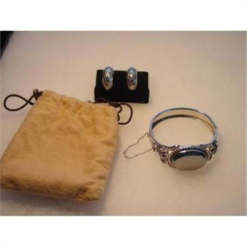 Here is a awsum Whiting & Davis Hematite Huge Bangle bracelet with a safety chain. There is lots of intricately detailing located around the stone. There is matching and signed earclips. This is in the original brown bag. All items are in excellent condition. My guess 1950-1960s