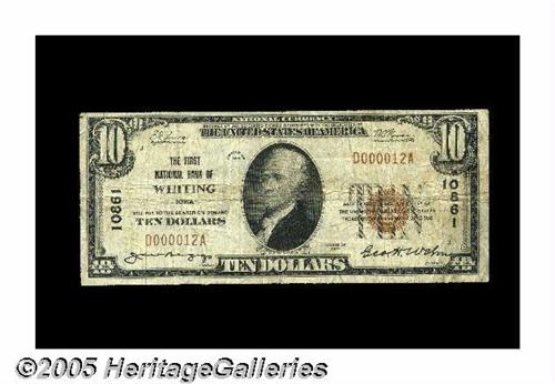 <B>Whiting, IA</B></I> - $10 1929 Ty. 1 <B>First NB</B></I> Ch. # 10861<BR>This was the only bank to issue from all of Monona County in Western Iowa. It is represented by a scant six 1929 survivors in the census and will likely sell in the range of...