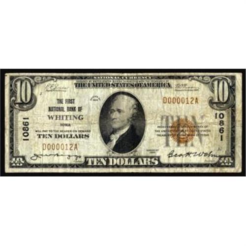 Whiting, IA. $10 1929 Ty. 1. The FNB. Charter #10861. Fine.