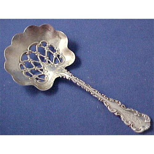 This is the 4 1/2" long sterling silver bon bon spoon in the ornate Victorian Louis XV pattern by Whiting. The bowl of this spoon is a fancy shape with lattice-like piercings. This spoon is monogrammed, possibly C E V and in extremely good condition.