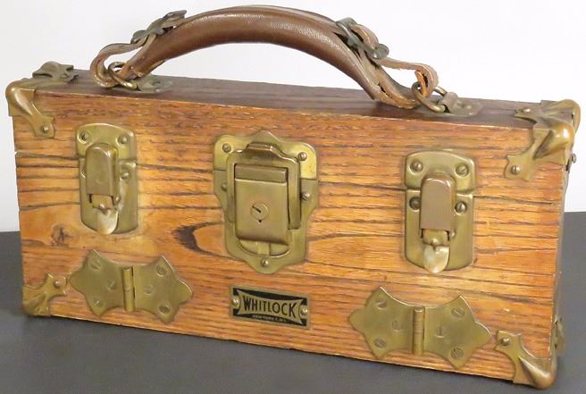 Whitlock Saleman Sample Locks and Hinges. Whitlock Co. New York, NY. Brass hardware mounted on quarter sawn oak with leather handle. 12 X 8 1/2 X 2 inches.